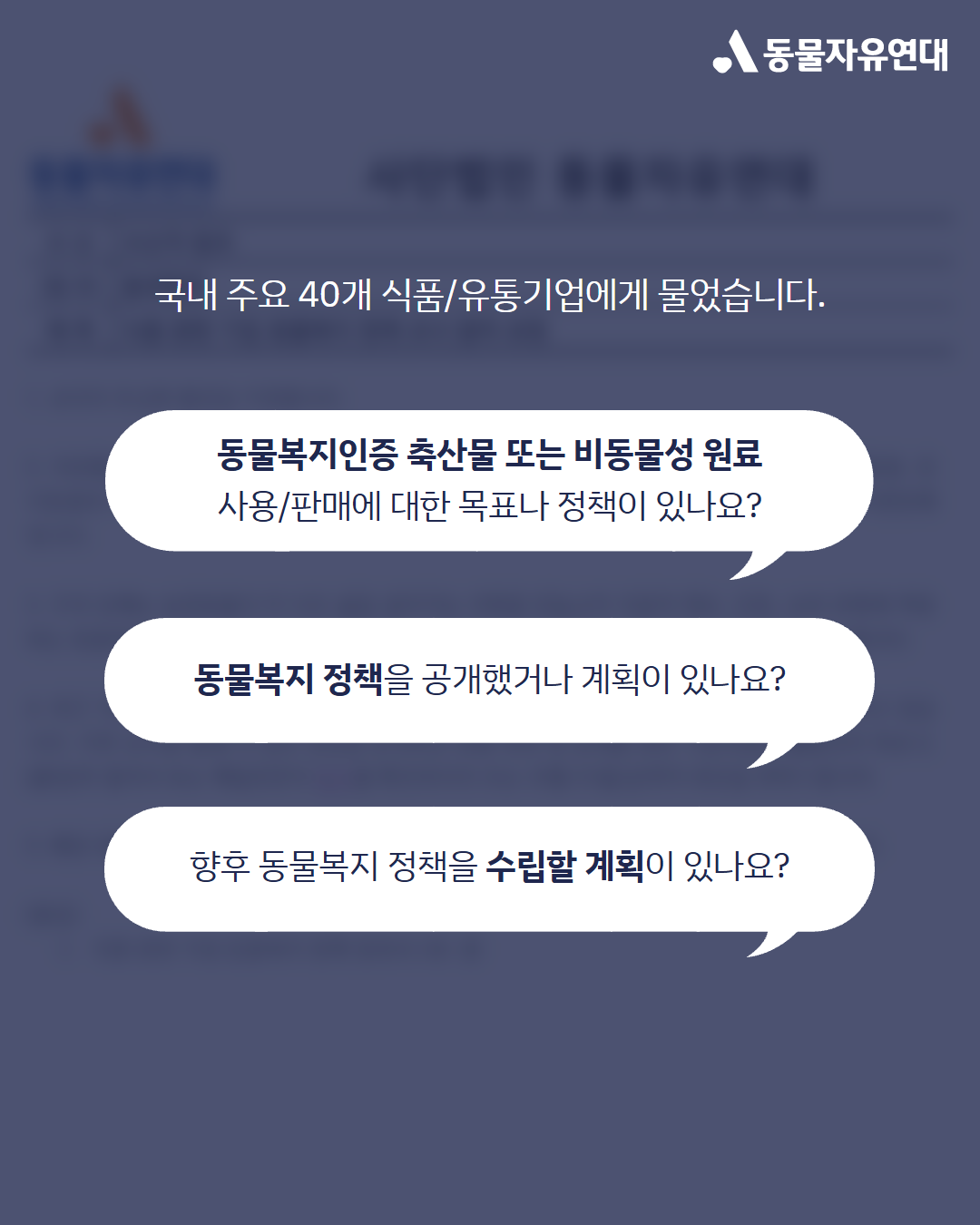 우리는 지난 10일, 40개의 식품 및 유통기업에 ‘동물복지 정책’에 대해 물었습니다.