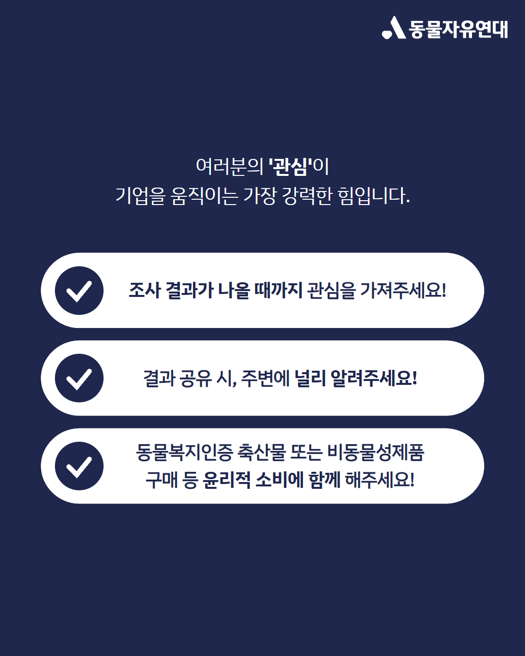 기업의 윤리적 경영과 소비자의 선택이 만날 때, 수 많은 생명들에겐 ‘고통을 줄어드는 변화’가 일어납니다.
