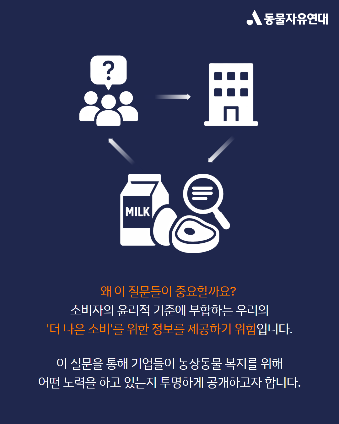 동물자유연대는 이번 조사를 통해 기업들이 농장동물 복지를 위해 어떤 노력을 하고 있는지 공개하고자 합니다.