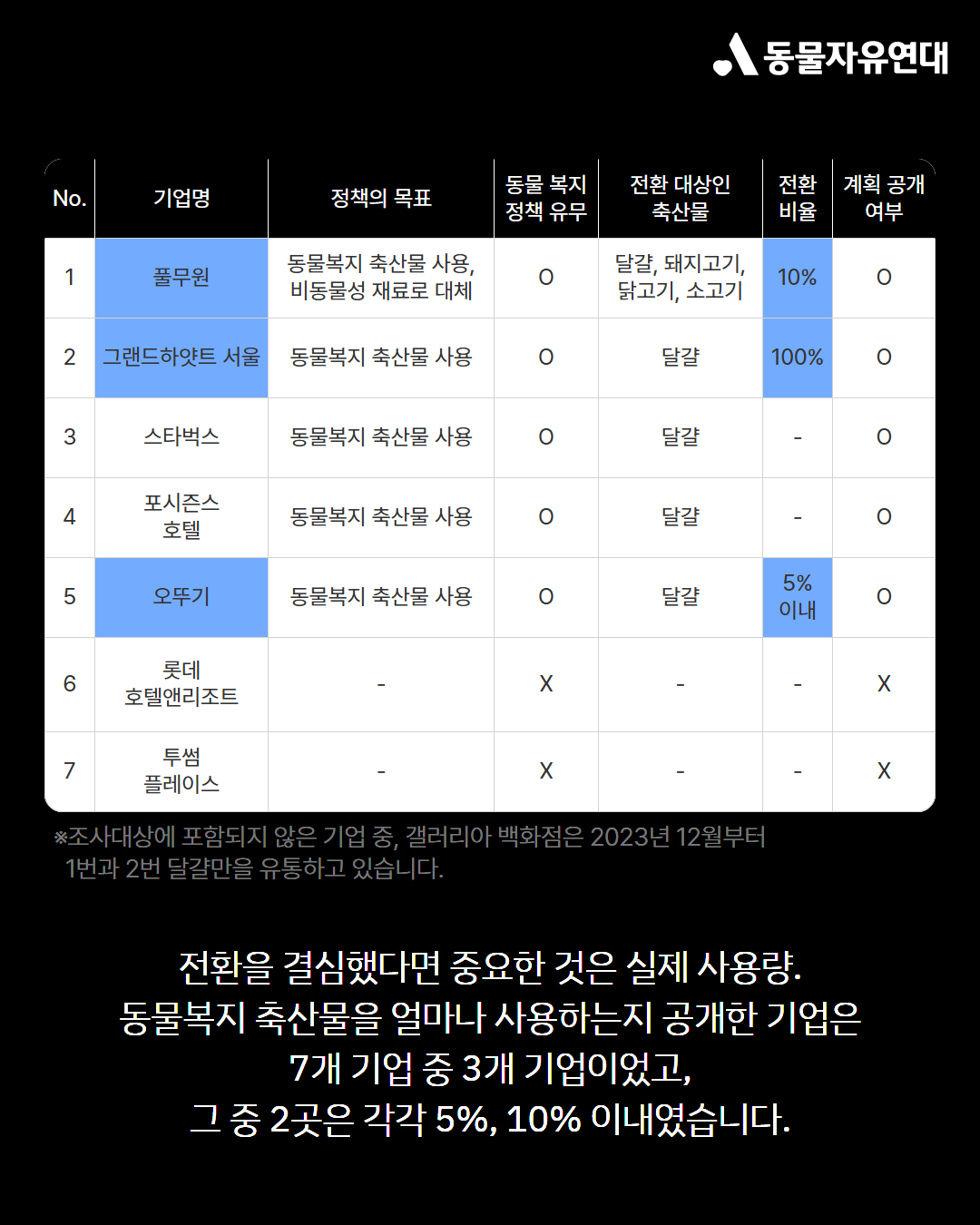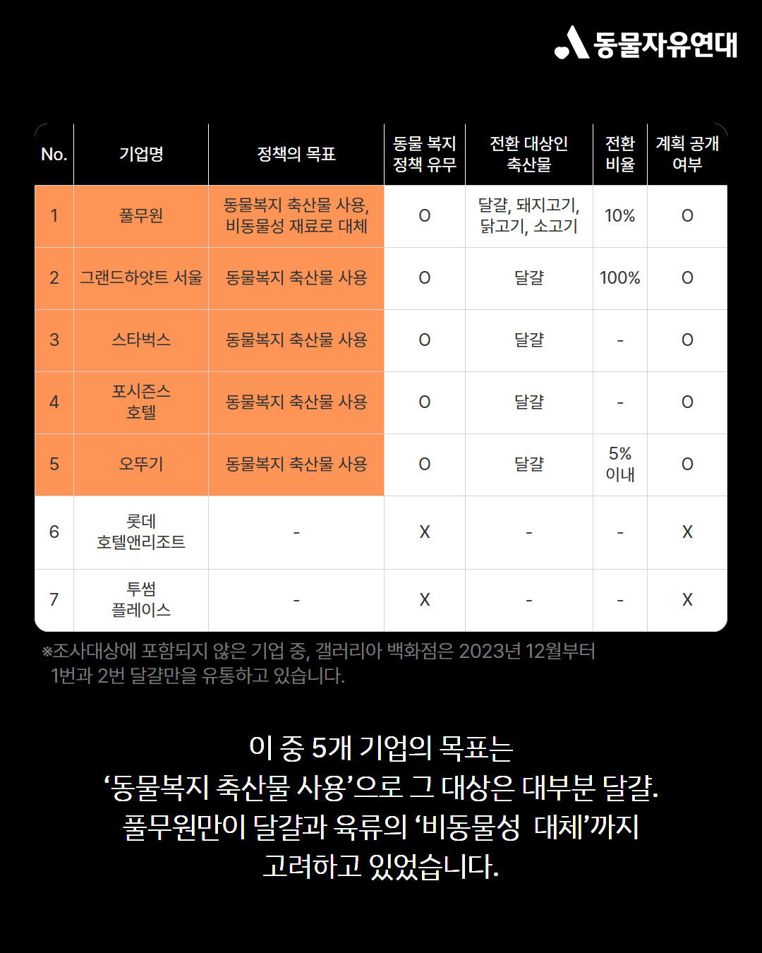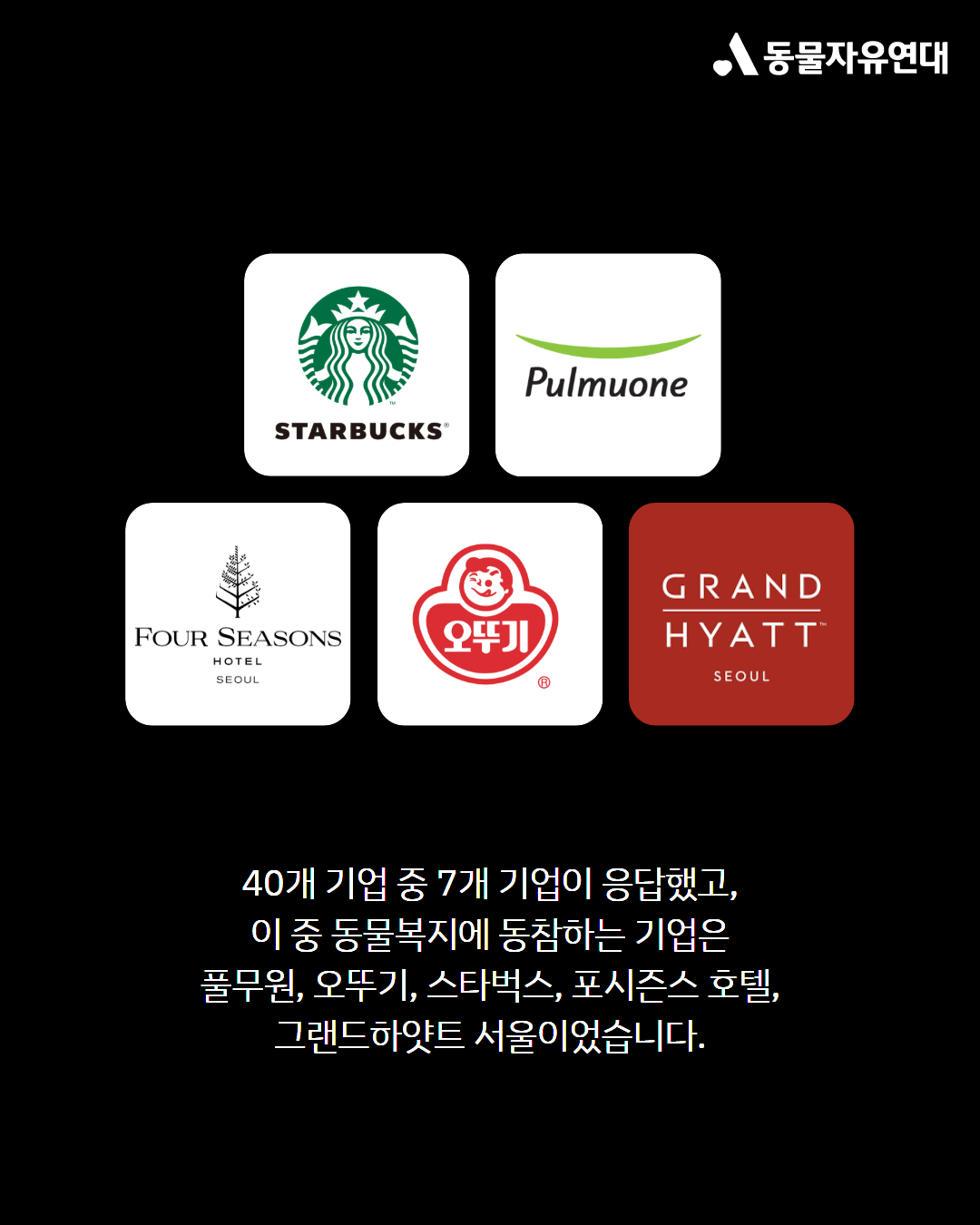 카페, 베이커리, 마트, 호텔 등 식품을 제조 또는 유통하거나 사용하는 기업 40개에 동물복지정책의 유무와 수준을 질문했습니다. 그 중 풀무원, 오뚜기, 스타벅스, 포시즌스호텔서울, 그랜드하얏트서울은 동물복지정책이 있다고 답변했고, 투썸플레이스와 롯데호텔앤리조트는 동물복지정책이 없다고 답변했습니다.