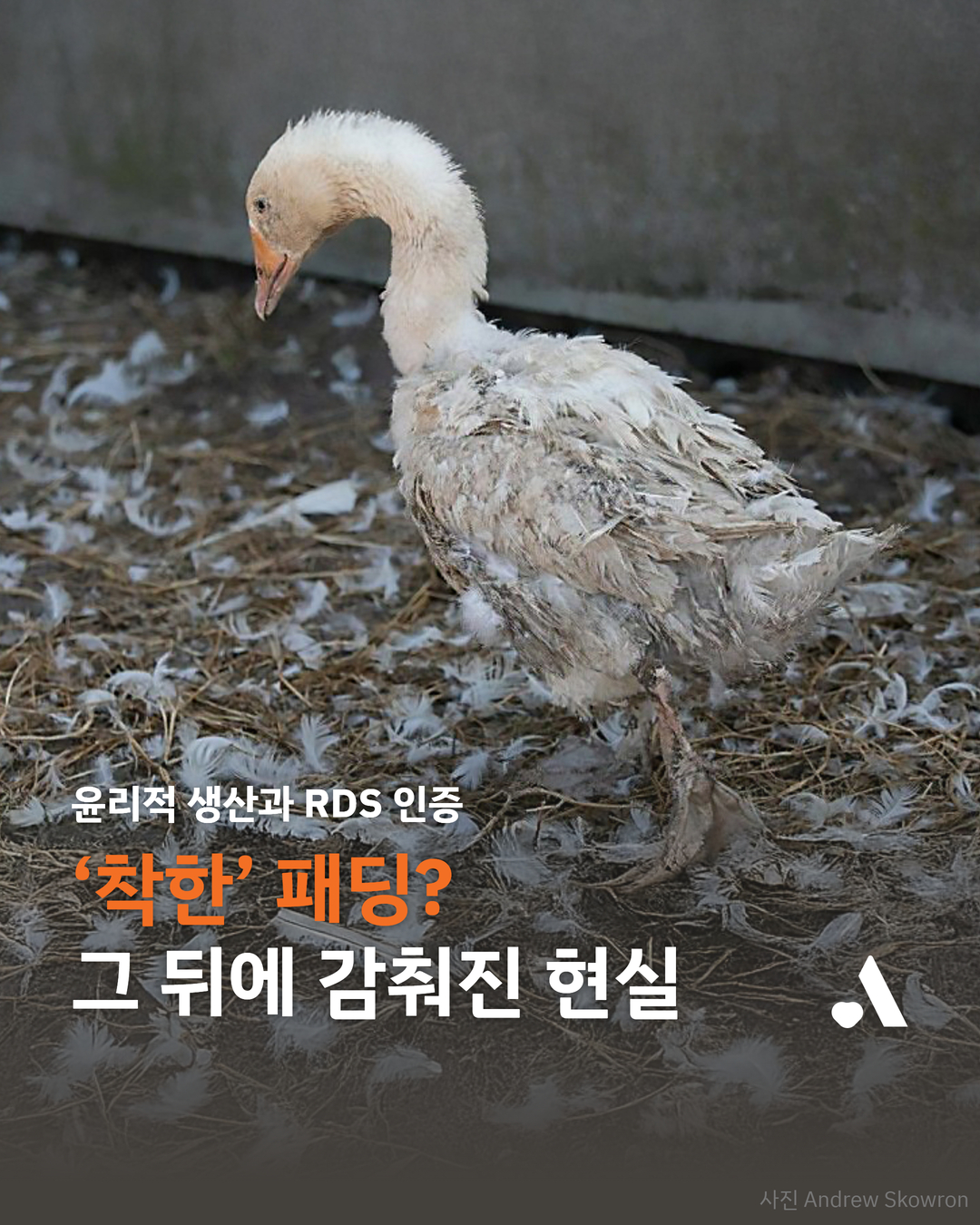 가슴털이 뽑혀 피부가 빨갛게 부어오른 오리나 거위 사진, 한 번쯤 보신 적 있으신가요. 겨울철 패딩의 보온재, 푹신한 침구나 소파, 그 안을 가득 채우는 다운(오리·거위 깃털)은 사실 고통의 산물이었다는 사실이 이제는 널리 알려졌습니다. 열악한 사육 환경과 잔인한 생산 방식에 다운을 거부하는 소비자들이 늘어나자 많은 기업들이 RDS 인증을 내세워 제품의 ‘윤리성’을 강조하기 시작했습니다.