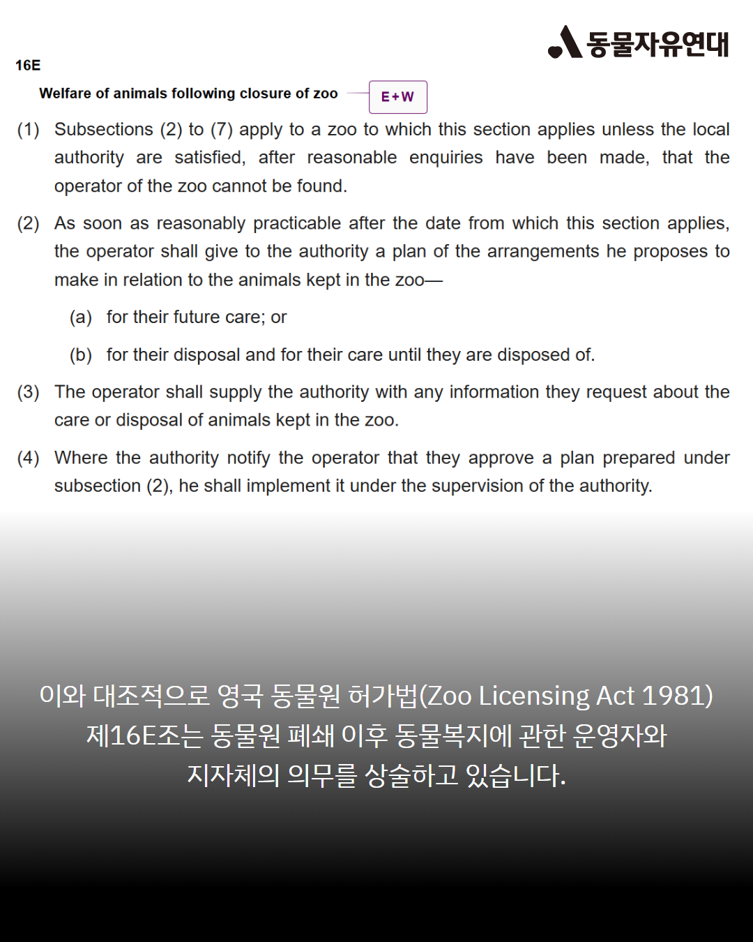 이와 대조적으로 영국 동물원 허가법(Zoo Licensing Act 1981) 제16E조는 동물원 폐쇄 이후 동물복지에 관한 운영자와 지자체의 의무를 상술하고 있습니다. 이 조항에 따르면 동물원 운영자는 잔류 동물 돌봄 및 처분 계획서를 당국에 제출해 승인을 받은 뒤 당국의 감독 하에 이를 실행하여야 합니다. 또한 동물의 복지를 위해 긴급한 상황으로 판단될 경우 당국에서 직접 동물의 돌봄 및 처분 조치를 취해야 한다는 의무사항을 명시하고 있습니다.