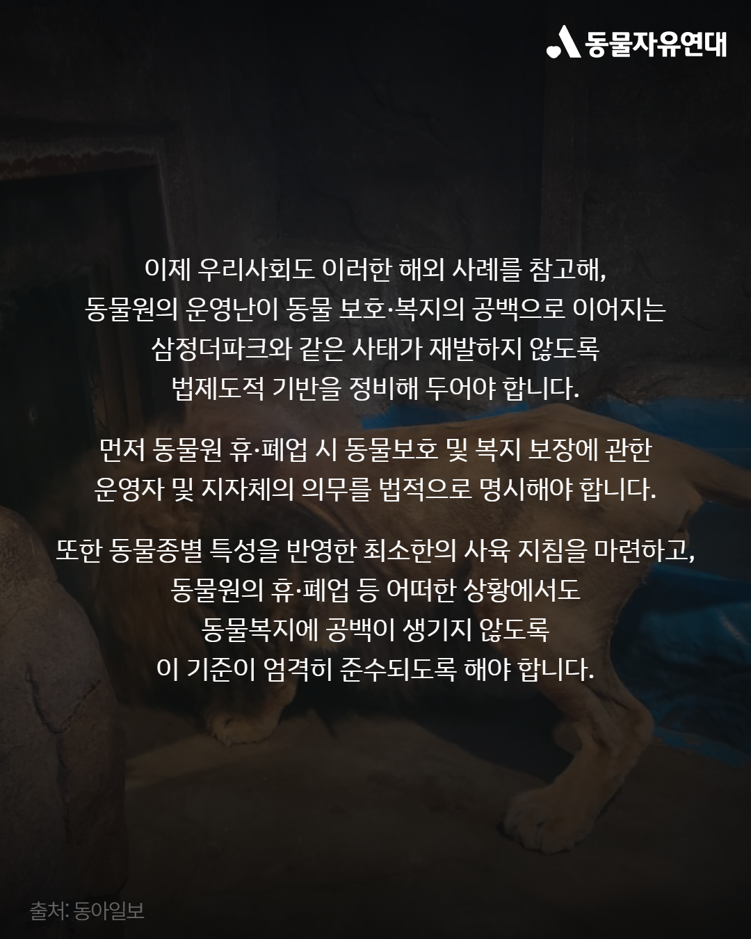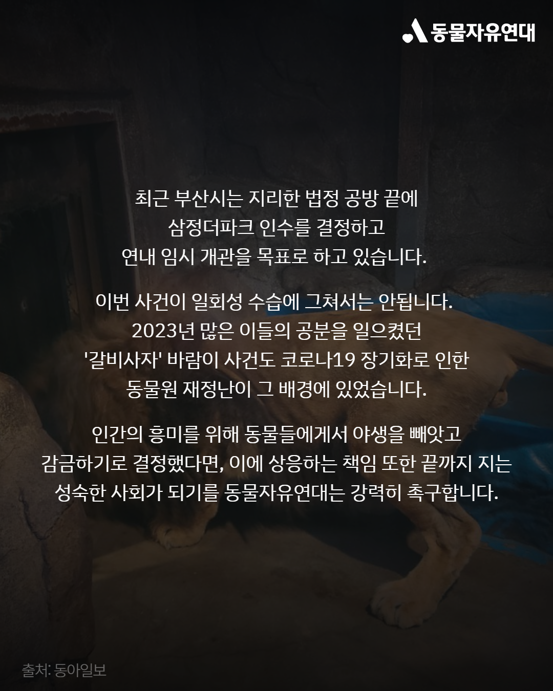 최근 부산시는 지리한 법정 공방 끝에 삼정더파크 인수를 결정하고 연내 임시 개관을 목표로 하고 있습니다. 이번 사건이 일회성 수습에 그쳐서는 안됩니다. 2023년 많은 이들의 공분을 일으켰던 '갈비사자' 바람이 사건도 코로나19 장기화로 인한 동물원 재정난이 그 배경에 있었습니다. 인간의 흥미를 위해 동물들에게서 야생을 빼앗고 감금하기로 결정했다면, 이에 상응하는 책임 또한 끝까지 지는 성숙한 사회가 되기를 동물자유연대는 강력히 촉구합니다.