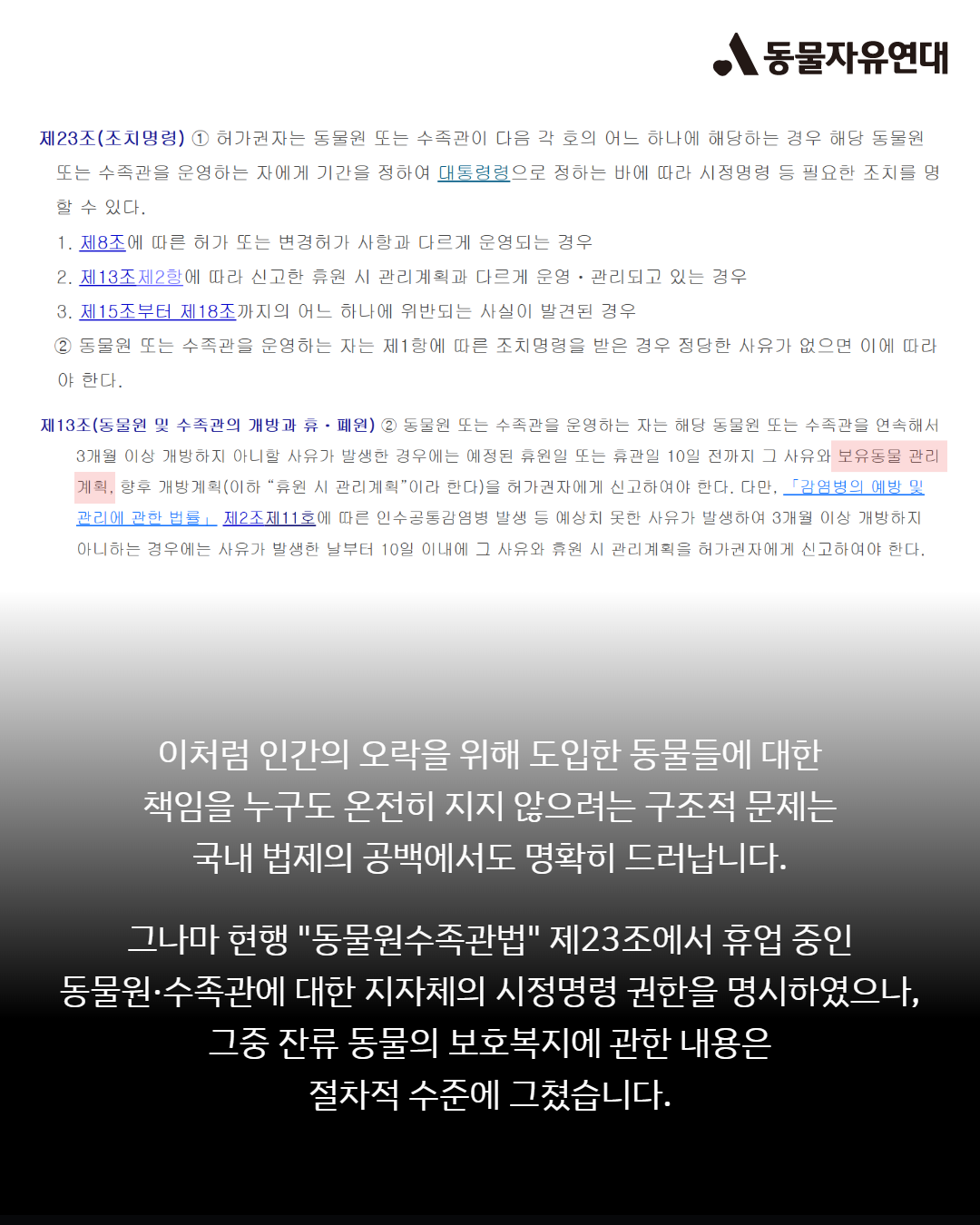 이처럼 인간의 오락을 위해 도입한 동물들에 대한 책임을 누구도 온전히 지지 않으려는 구조적 문제는 국내 법제의 공백에서도 명확히 드러납니다. 그나마 현행 "동물원수족관법" 제23조에서 휴업 중인 동물원·수족관에 대한 지자체의 시정명령 권한을 명시하였으나, 그중 잔류 동물의 보호복지에 관한 내용은 절차적 수준에 그쳤습니다.