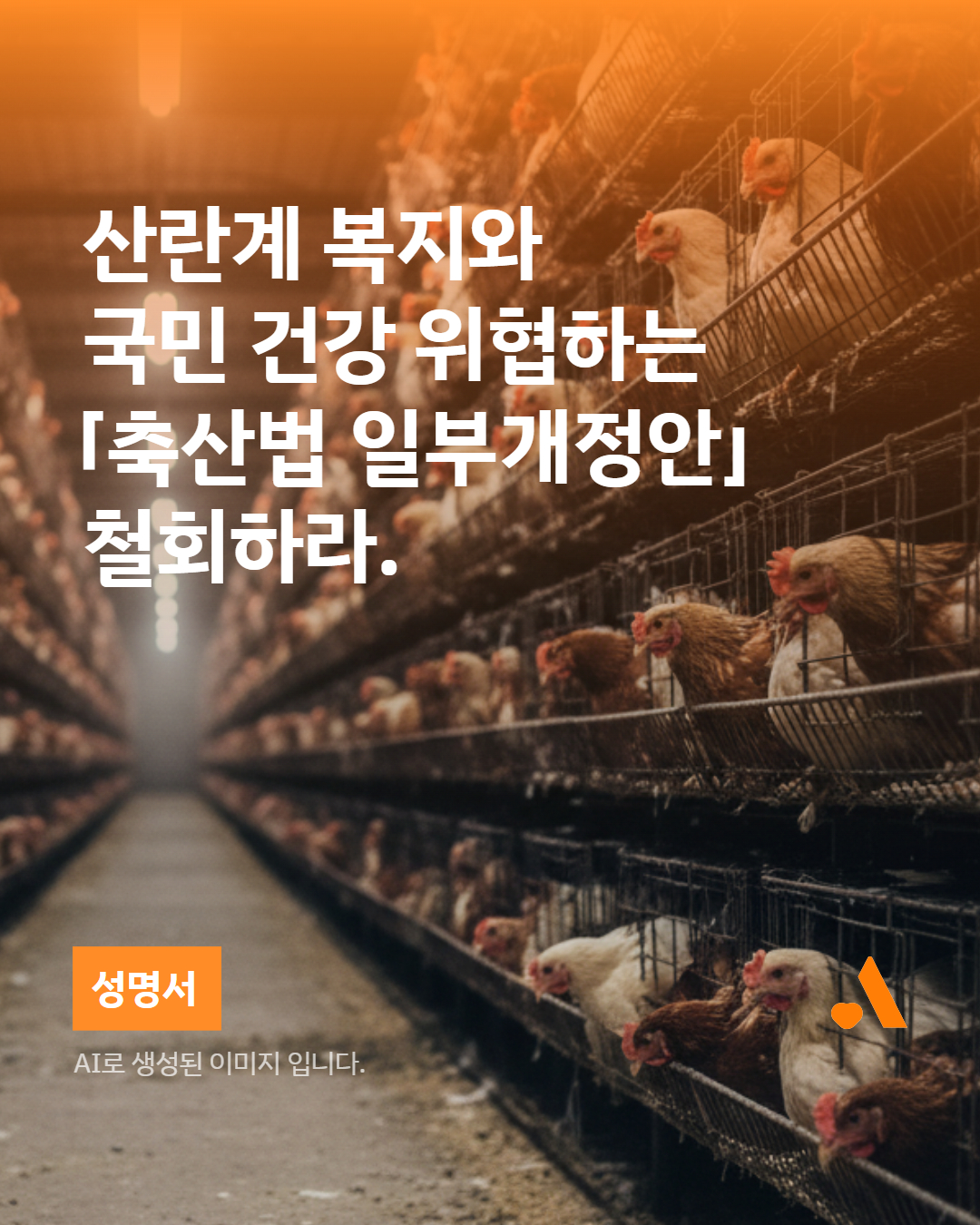 지난 9월 8일 서천호(국민의힘) 의원은 산란계와 백신산란계 사육업에 한해 최소 사육면적을 0.05㎡로 유지하는 내용을 담은 「축산법 일부개정법률안」을 발의했다. 정부가 2018년 「축산법 시행령」을 개정해 산란계의 사육면적을 0.075㎡(개선된 케이지)로 확대하려던 것을 뒤집고 기존의 0.05㎡ 케이지, 이른바 배터리 케이지를 유지하게 하고 정부가 임의로 변경할 수 없도록 법률로써 못 박겠다는 것이다. 이는 동물복지의 후퇴뿐 아니라 국민 건강 역시 위협할 수 있는 무모한 시도이다.