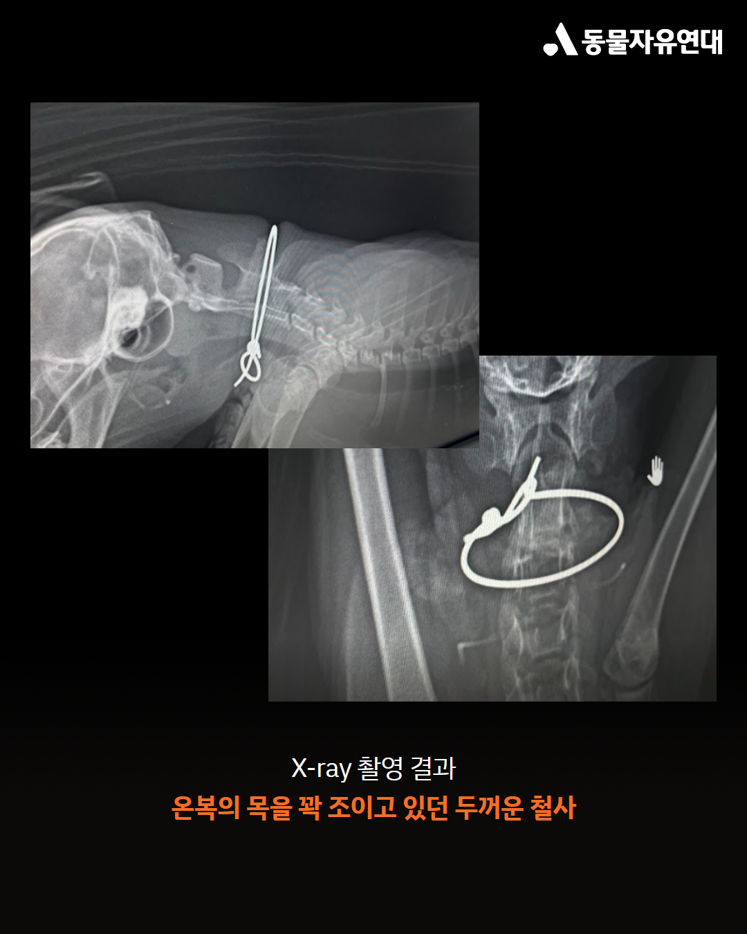 즉시 고양이를 병원으로 이송하여 간단한 검진을 받았고, X-ray 촬영본을 통해 확인한 도구는 얇은 나일론실이 아닌 두꺼운 철사였습니다.