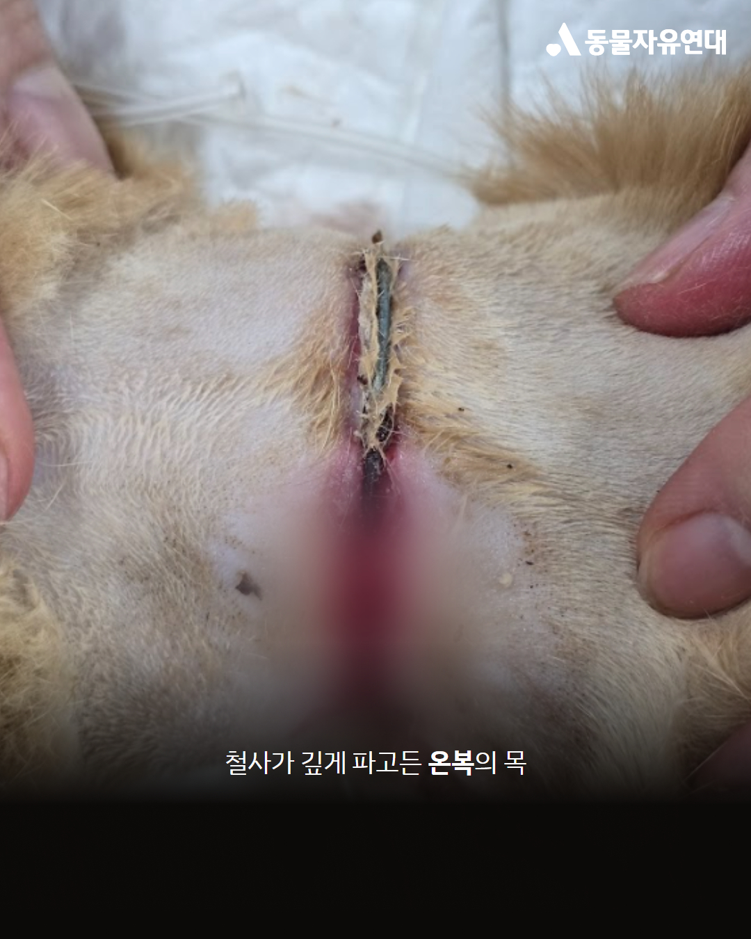 목을 조이고 있는 도구는 털에 가려져 확실히 파악하기 어려웠으나, 치료가 시급해 보였기에 구조를 서둘렀습니다.