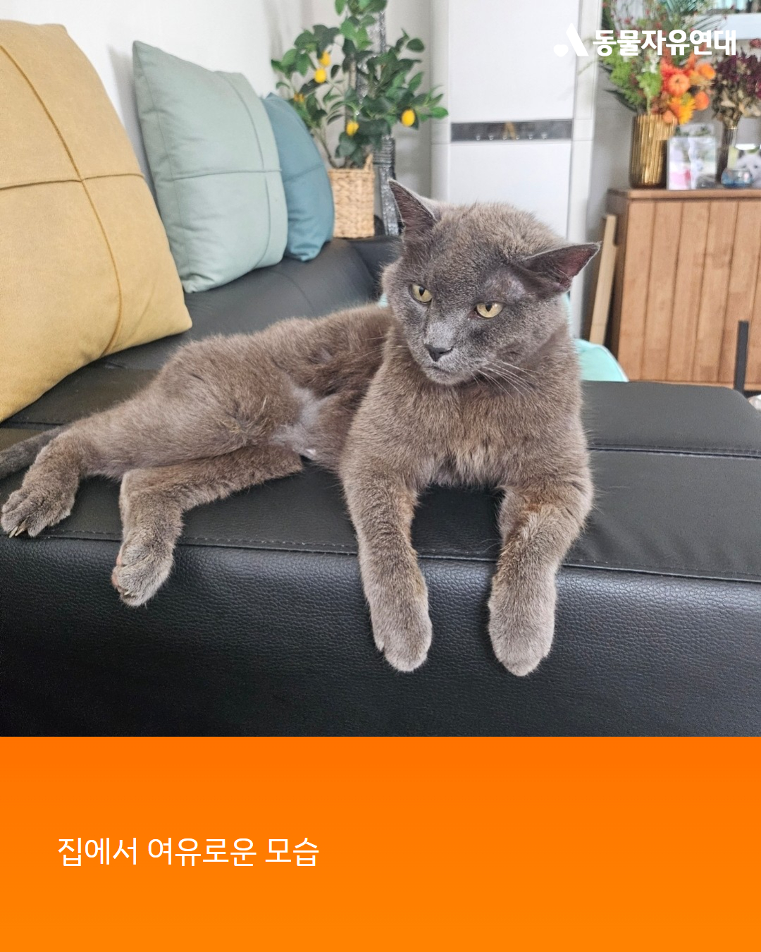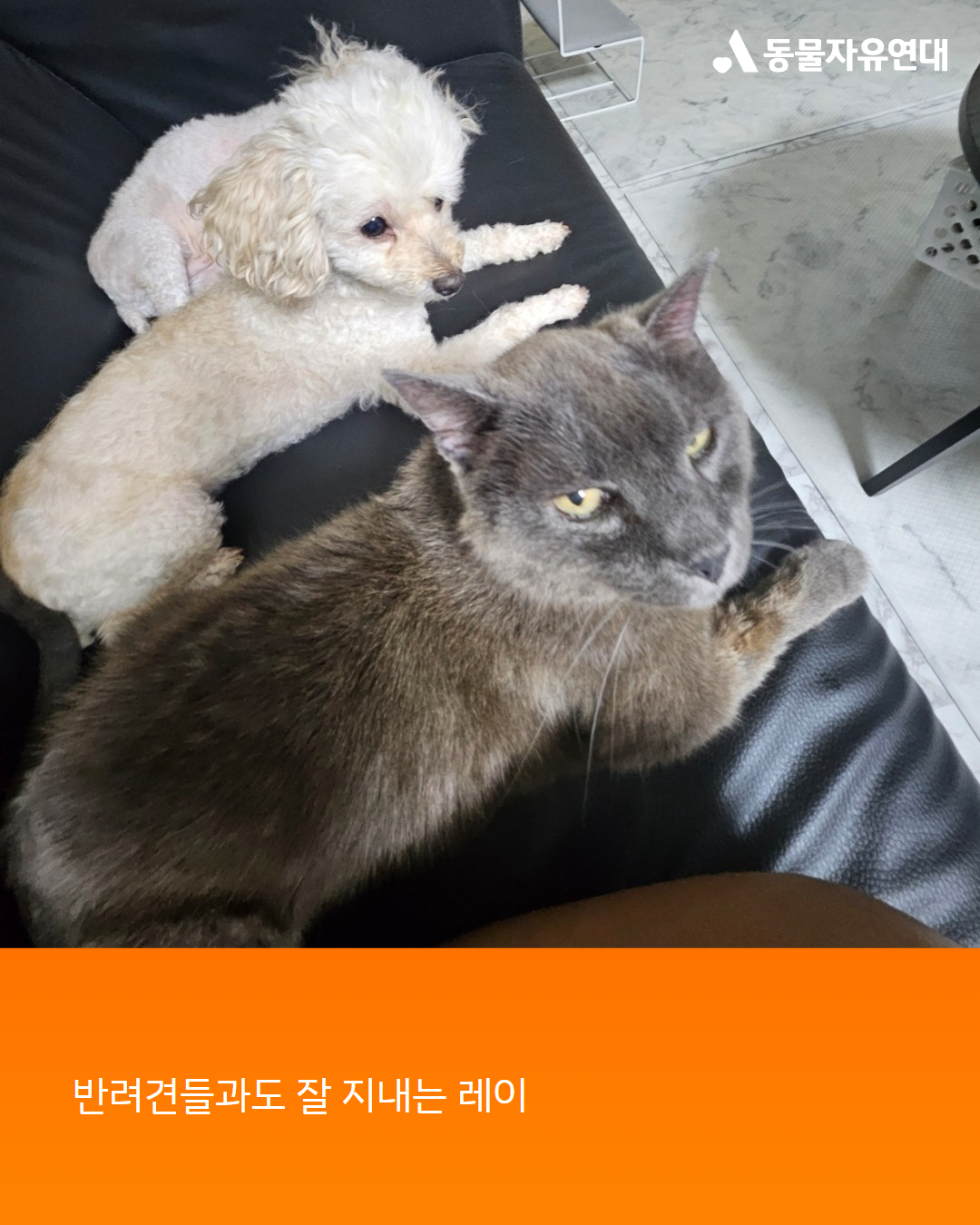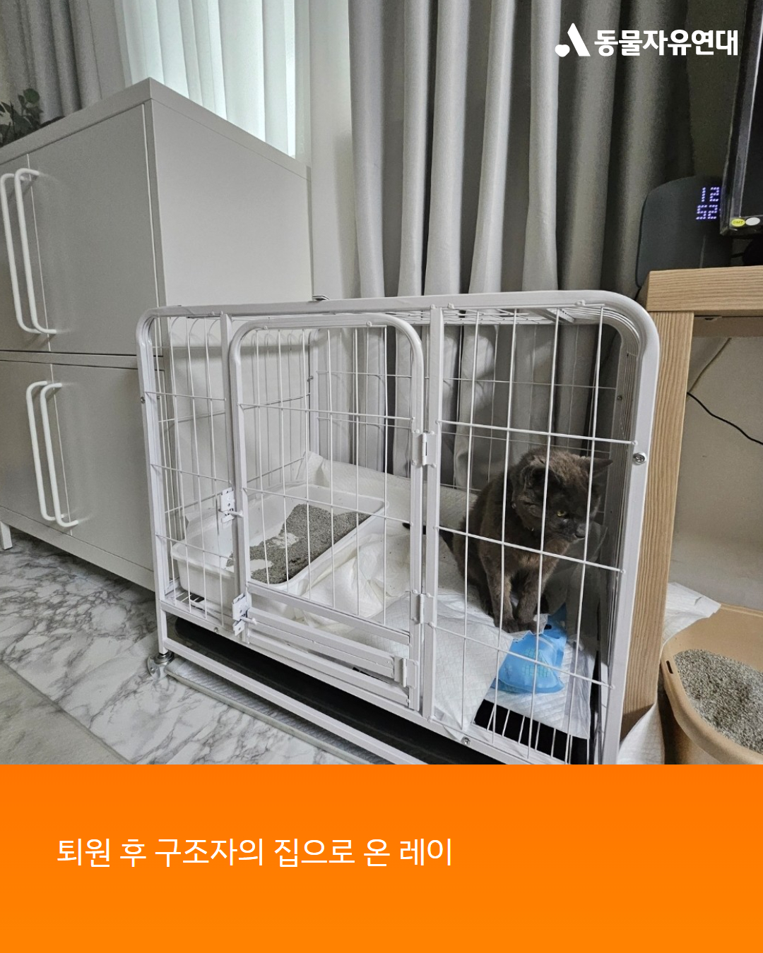 수술을 마치고 구조자는 고양이를 데리고 집으로 퇴원했습니다. 집에는 방묘문을 설치했고 고양이를 위한 공간도 마련했습니다. 고양이는 구조자의 반려동물들과도 잘 지냈습니다. 그렇게 고양이는 소중한 가족 ‘레이’가 되었고 함께 살게 되었습니다.