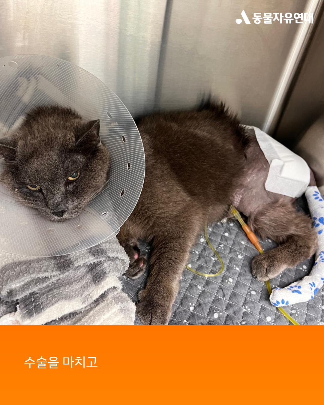 바로 24시 동물병원으로 데려갔습니다. 검사 결과, 늑골 골반으로 차가 치고 지나간 것 같다고 수술해야 한다고 했습니다. 그리고 갑상선에 종양이 있어서 수술 여부와 앞으로 돌봄 방법에 대해서 논의했습니다.