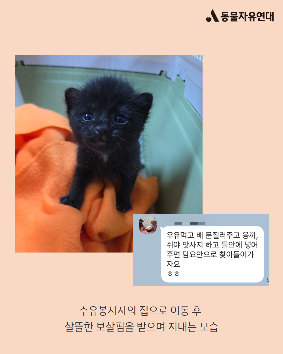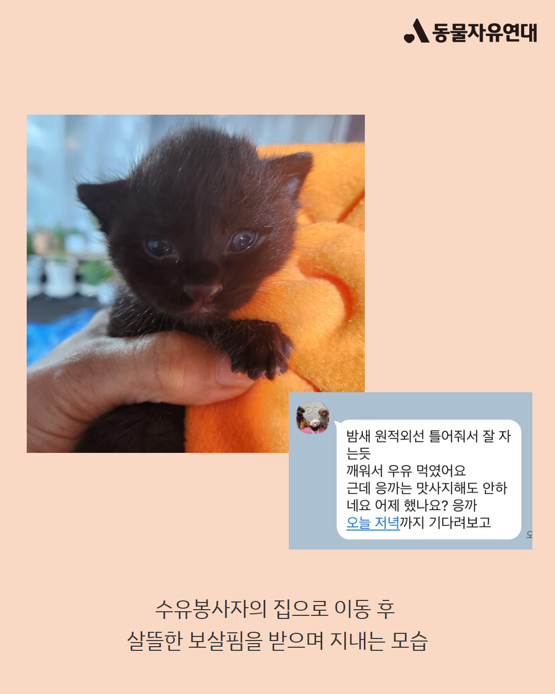 제보자 덕분에 구조는 할 수 있었지만 그 이후가 더 큰 문제였습니다. 수용 한계를 넘어선 온캣에서는 몇 시간에 한 번씩 수유와 배변이 필요한 새끼고양이를 돌볼 여력이 없었습니다. 그 때 또 하나의 손길이 이어졌습니다. 단체에서 진행하는 지원 사업인 ‘캣동지 협의체’ 중 하나 ‘성동서울숲길고양이돌보미협회’에서 수유 봉사를 맡아주기로 한 것입니다.