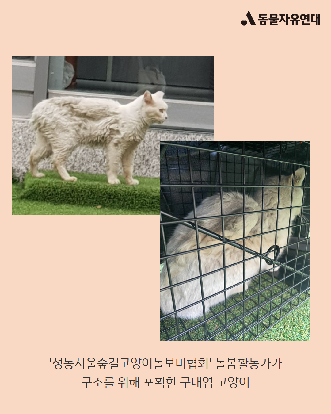 이 협회는 2015년부터 서울숲 길고양이 급식소 봉사를 하면서 꾸준한 TNR로 개체수를 안정화하고 구조 및 치료, 입양까지 적극적으로 활동하는 돌봄활동가 모임입니다. 또한 동물자유연대 사무실 인근에서 활동하고 있어 이번처럼 단체의 여력이 부족할 때에도 도움을 주는 든든한 조력자입니다.
