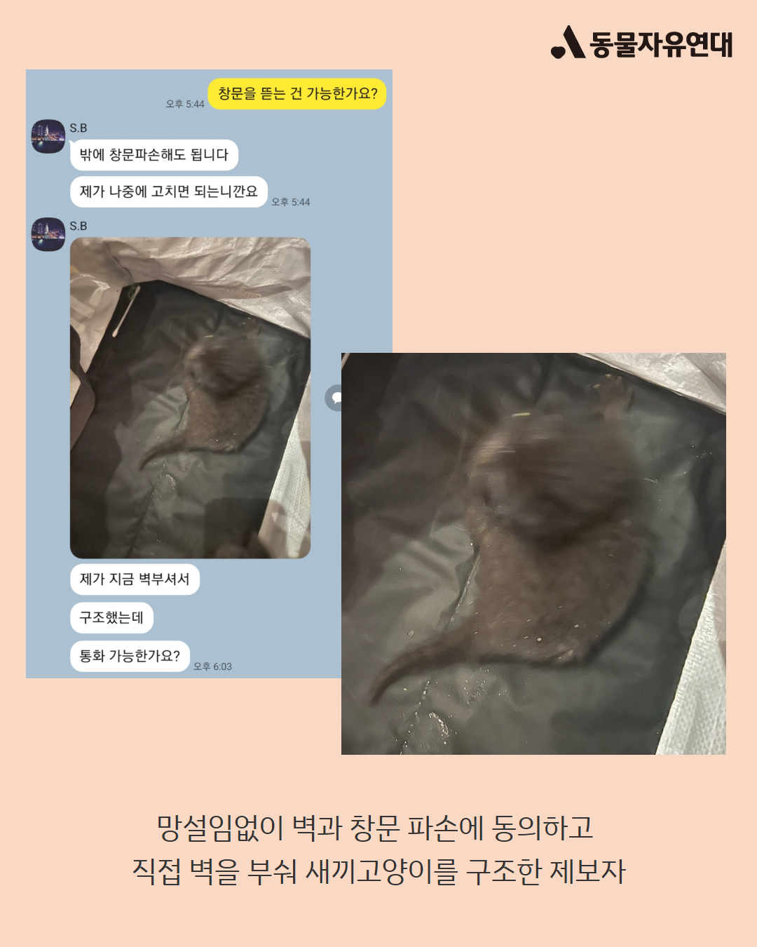 단체에서 출동 준비를 하며 협조를 구하기 위해 창문을 뜯어도 괜찮을지 문의하자 제보자는 일말의 망설임도 없이 “파손해도 된다”고 답했습니다. 그리고 잠시 후 “지금 벽을 부숴서 구조했다”는 연락이 왔습니다. 활동가들이 도착하기도 전에 스스로 벽을 부수고 아깽이를 구조한 것입니다.