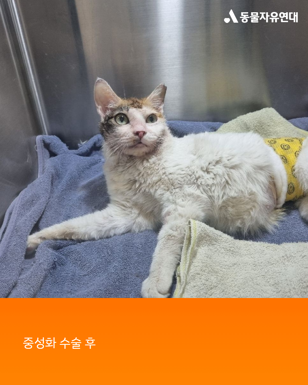 누가 봐도 심하게 아파 보이는데 바로 구조할 수 있는 방법을 찾다 구조자는 후원하고 있는 동물자유연대의 쓰담쓰담 위기동물 지원사업이 떠올랐습니다. 구조도 처음이고 지원사업 신청도 처음이었지만, 우선 아이를 먼저 살려야겠다는 생각에 구조해 평소에 다니는 동물병원으로 갔습니다. 심한 중이염과 구내염으로 인한 심한 탈수라고 했습니다. 바로 입원시키고 수액 처치를 하며 아이의 컨디션을 살펴보기로 했습니다. 다행히도 다음날 아이는 밥을 먹을 수 있을 정도로 회복했습니다. 그리고 구내염, 중이염 치료와 중성화 수술을 하기로 했습니다. 아이는 잘 회복했고 중이염은 재발가능성이 있다는 수의사 선생님의 의견에 따라 몇 주간 항생제를 투약하기로 했습니다. 항생제를 먹이니 귀를 털며 휘청거리는 모습도 없어지고, 밥도 잘 먹고 아이는 빠르게 상태가 좋아졌습니다.