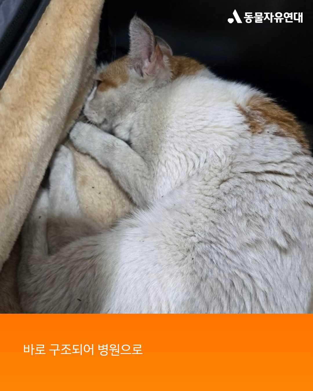 폭염이 지속되던 지난여름, 아파트 화단에 쓰러져 있는 고양이 한 마리를 발견했습니다. 움직이지 못하고 힘없이 쓰러져 있는 고양이를 본 순간 바로 지자체 동물보호팀에 전화했지만 3시간쯤 후에 아이를 데려갈 수 있다고 했습니다. 데려가도 연계 병원에 가서 간단한 처치 후 방사한다는 답변이 왔습니다.