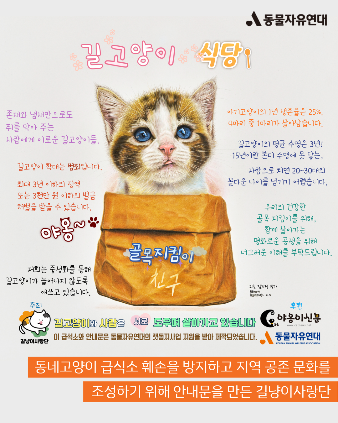 동네고양이 급식소 훼손 문제를 막기 위해 귀엽고 친근한 급식소 안내문을 제작하여