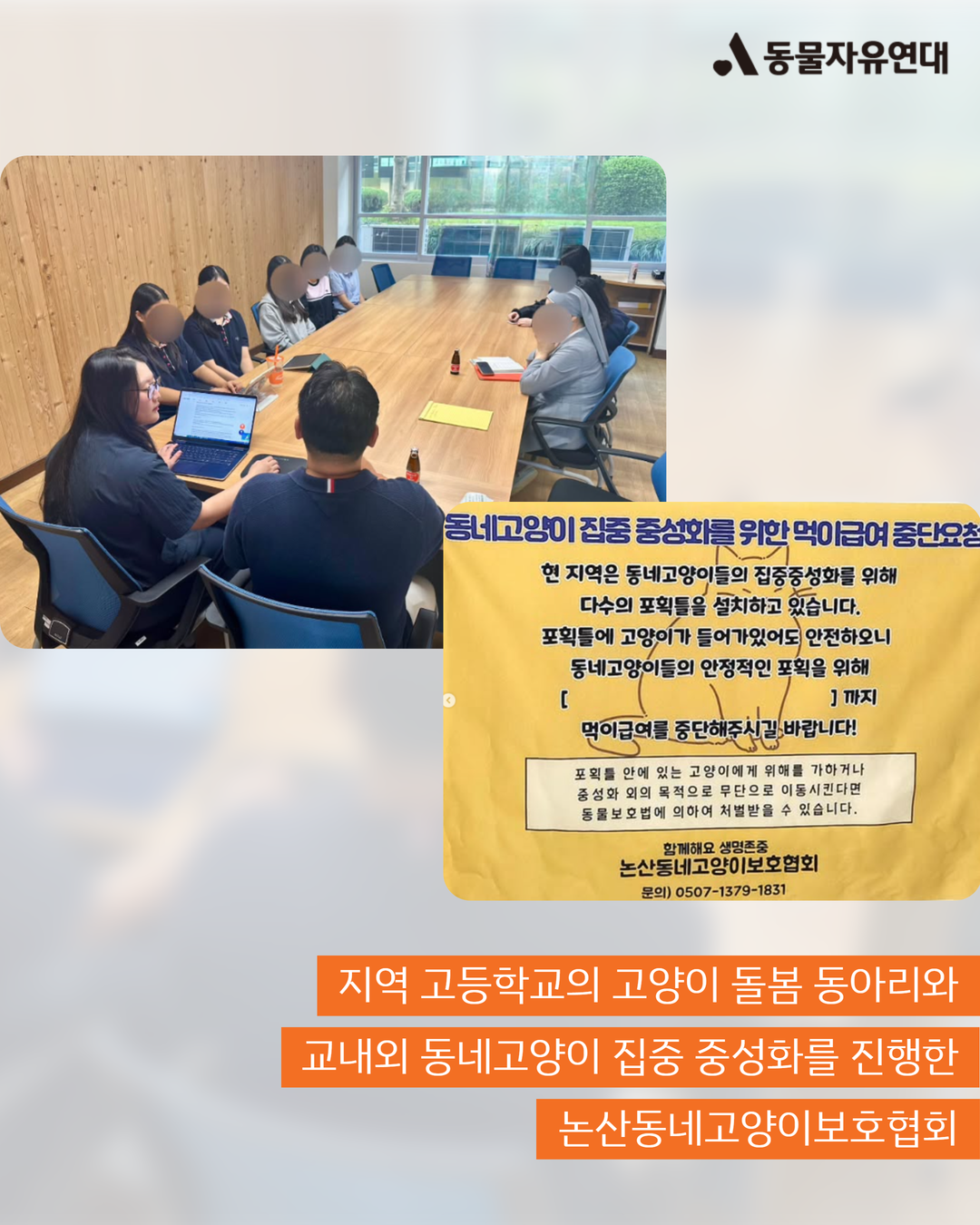 지역 고등학교의 고양이 돌봄 동아리와 연계해 교내외 집중 중성화 사업을 진행했습니다.