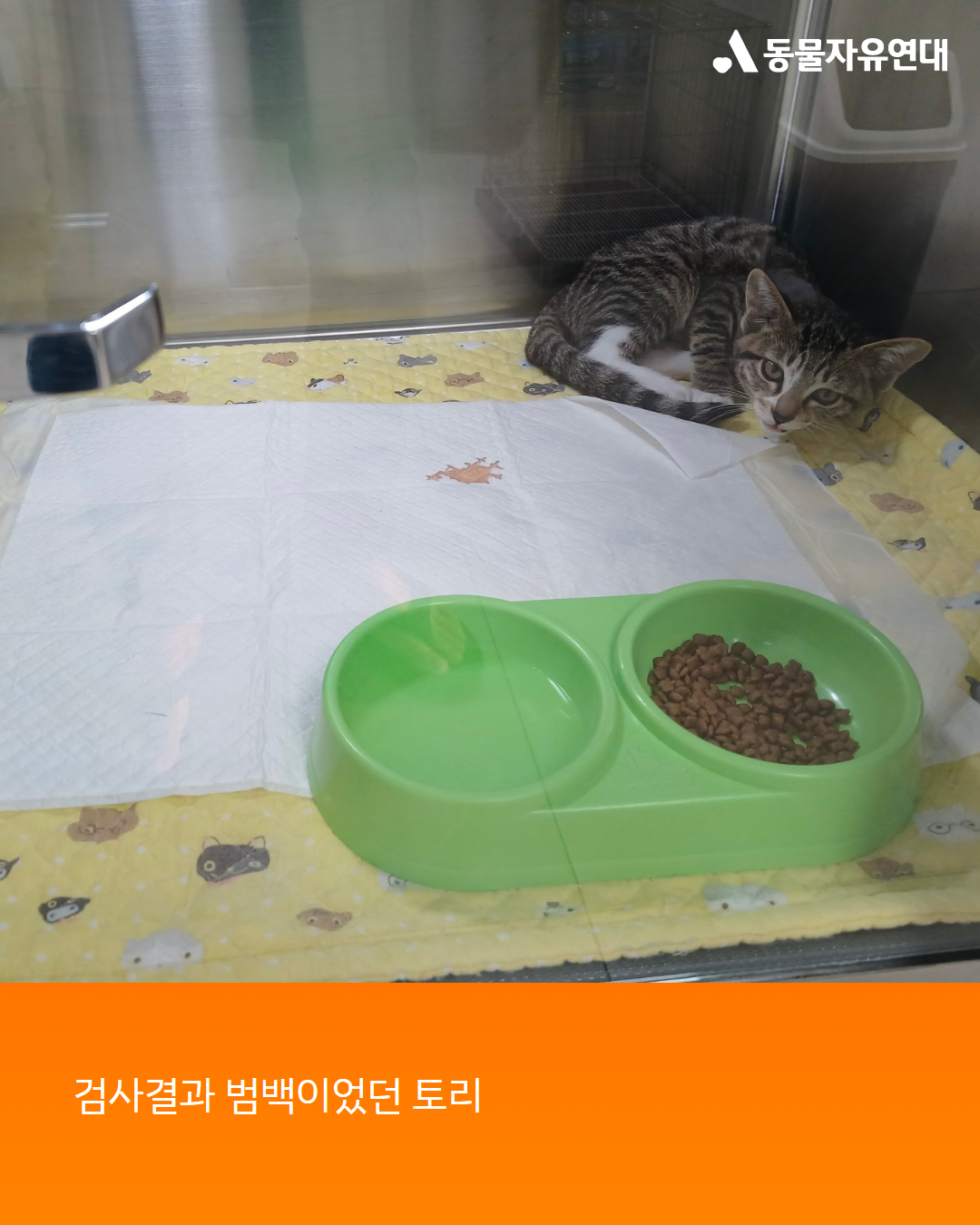 집으로 데려오기 전에 검사를 위해 토리를 병원으로 데려갔습니다. 뜻밖으로 건강한 토리가 범백 양성이 나왔습니다. 아마도 죽었다는 아기고양이가 범백이었던 것 같았습니다. 범백 치료가 가능한 병원을 소개받고 바로 입원시켰습니다. 토리는 입원하면서 항혈청 항생제를 투여하고 적극적으로 치료하였고 빠르게 완치되었습니다