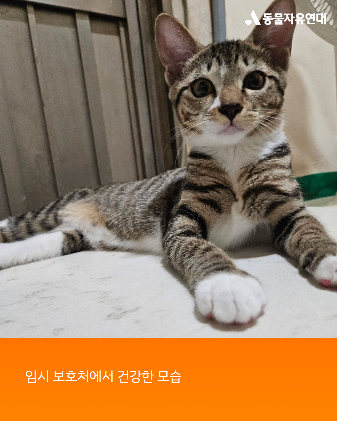 토리는 퇴원 후 범백 잠복 기간에 발생할 수 있는 전염 걱정이 없는 곳에서 지내야 했습니다. 다행히 지인이 사무실에 작은 방이 있다고 해서 그곳에서 보호했습니다. 낮에는 사무실에서 근무하시는 분이 놀아 주며 보살펴 주었고 저녁 시간에는 구조자가 돌봤습니다.