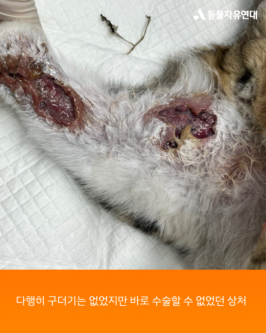 며칠간 보이지 않던 메이가 어느 날 저녁 다시 보였는데 힘없이 쓰러져 있었고 간식을 주어도 먹지 않고 구조자만 바라보았습니다. 다리를 확인해 보니 허벅지에 깊은 상처가 나 피부 손상이 심하고 속살과 근육, 뼈까지 드러난 심각한 상태였습니다.
