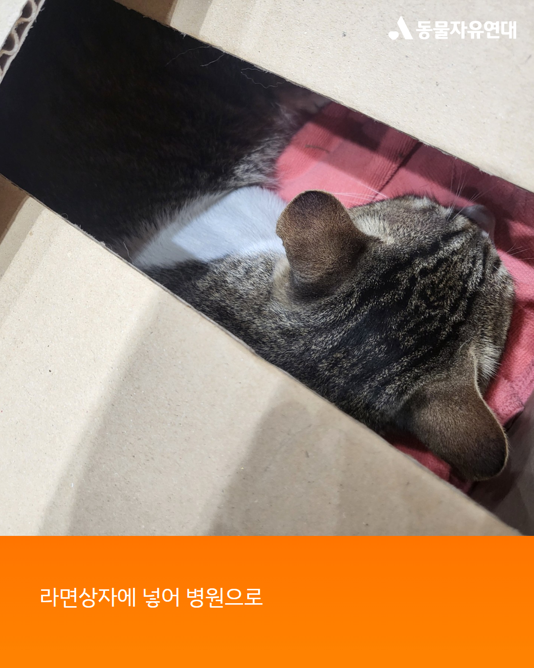 그대로 두면 죽겠다는 생각에 급히 박스를 구해 메이를 넣어 동물병원으로 갔습니다. 이동하는 동안 메이는 울지도 움직이지도 않고 고개만 내밀며 살려달라는 듯한 눈빛을 보였고, 그 간절한 눈빛에 반드시 치료해야겠다고 다짐했습니다.