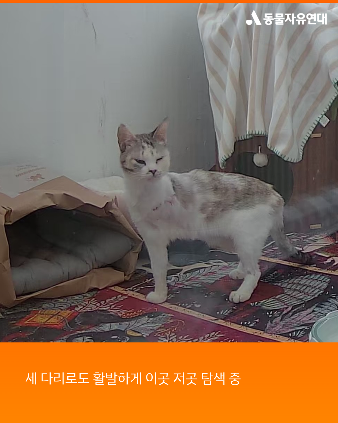 세 다리로도 놀라울 만큼 활발하게 지내며 삶에 대한 의지를 보여주고 있습니다.