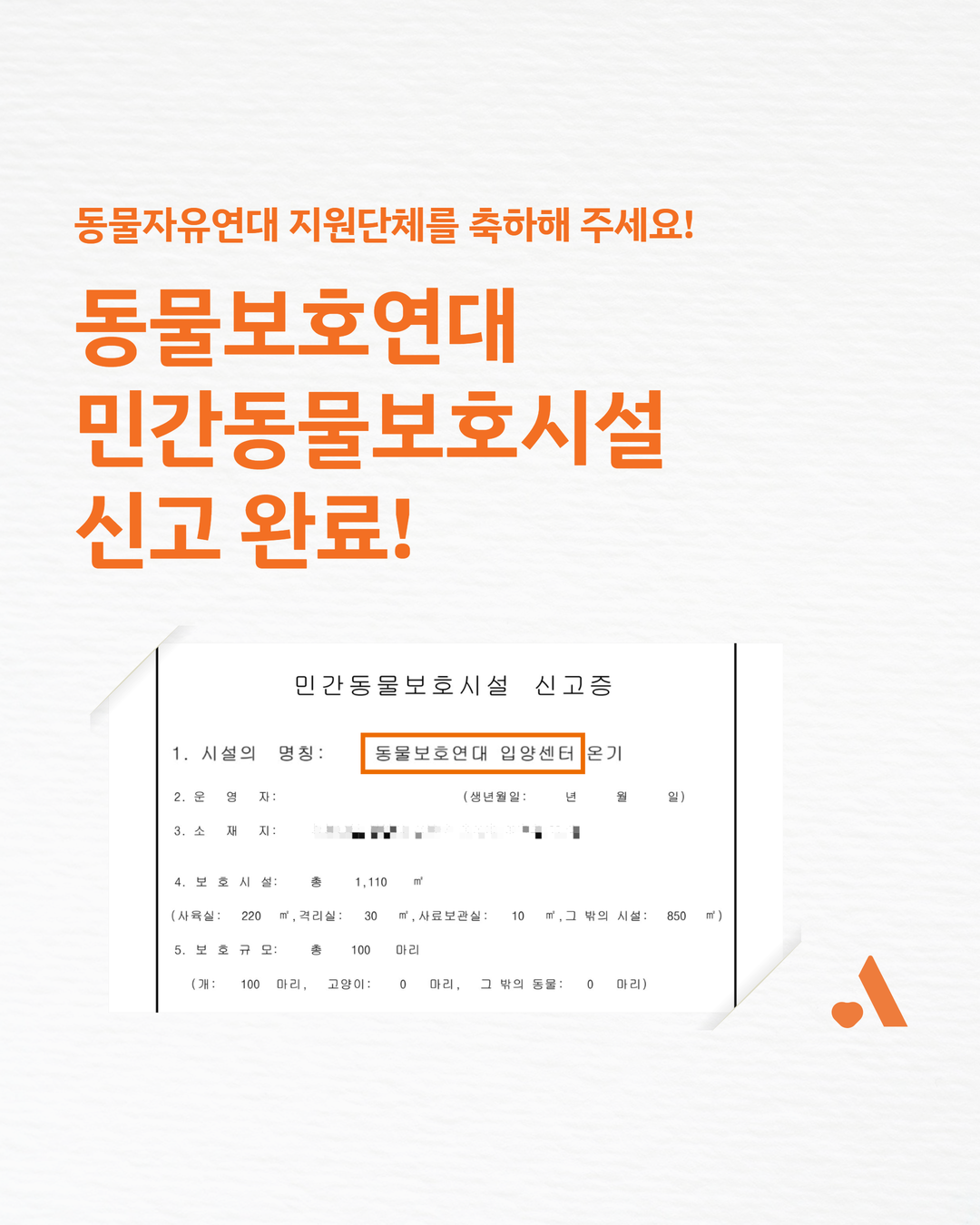 동물자유연대가 지원하는 단체 가운데 지자체 신고를 최초로 완료한 사례입니다.