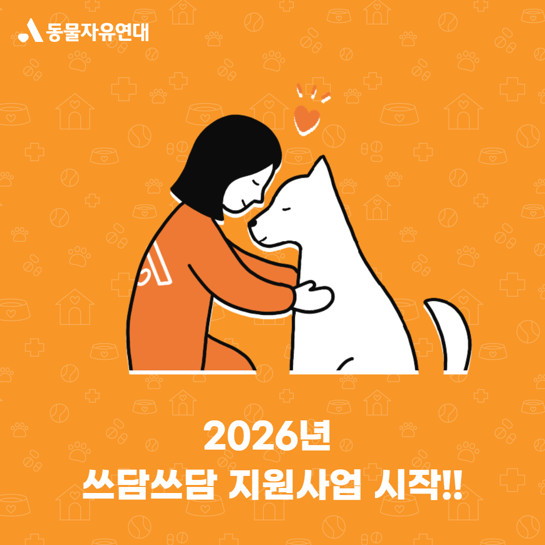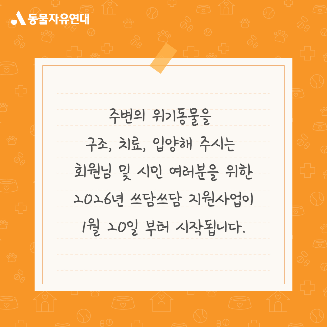 주변의 위기동물을 구조, 치료, 입양해 주시는 회원님 및 시민 여러분을 위한 2026년 쓰담쓰담 지원사업이 1월 20일 부터 시작됩니다.