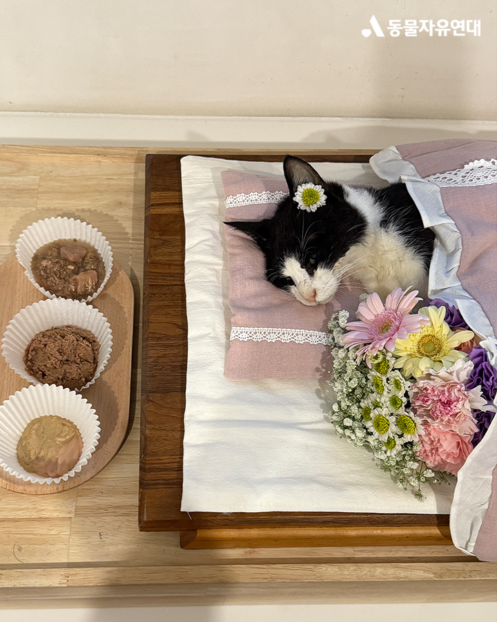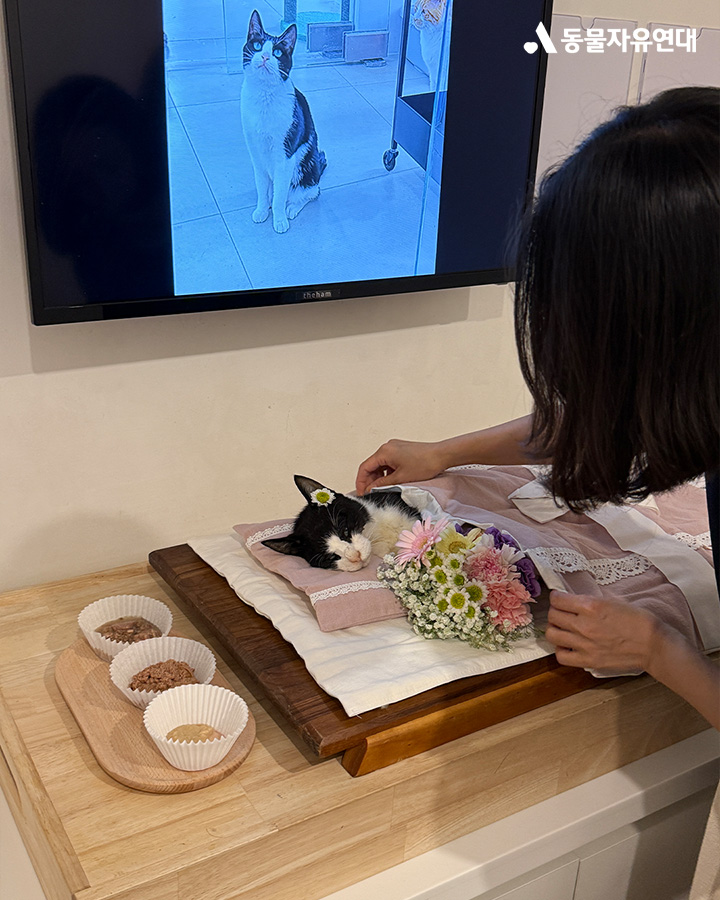 태미와 마지막 시간을 보내며 활동가들은 태미에게 마음속 이야기를 전했습니다. 하루에도 몇 번씩 처치를 받으며 우리와 함께 신부전과 싸워준 것에 대한 고마움, 좋아하는 간식을 마음껏 주지 못해 늘 미안했던 것, 우리에게는 쉽게 다가오지 않으면서 친구들과는 꼭 붙어 지내는 모습이 얼마나 귀여웠는지 이야기해 주었습니다.