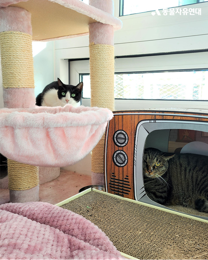2018년, 교통사고를 당해 도로 위에 쓰러져 있던 작은 고양이 태미. 태미는 하반신에 심한 골절상을 입어 수술을 받아야 했습니다. 왼쪽 뒷다리를 절뚝거리는 후유증이 남았지만 일상생활에 문제가 없을 정도로 회복된 것이 다행이었습니다. 한 살도 안 된 어린 나이에 큰 고통을 겪어야 했던 태미는 경계심이 많았지만, 고양이 친구들과는 늘 다정하게 지내며 특히 단짝 친구와 꼭 붙어 다녔습니다.