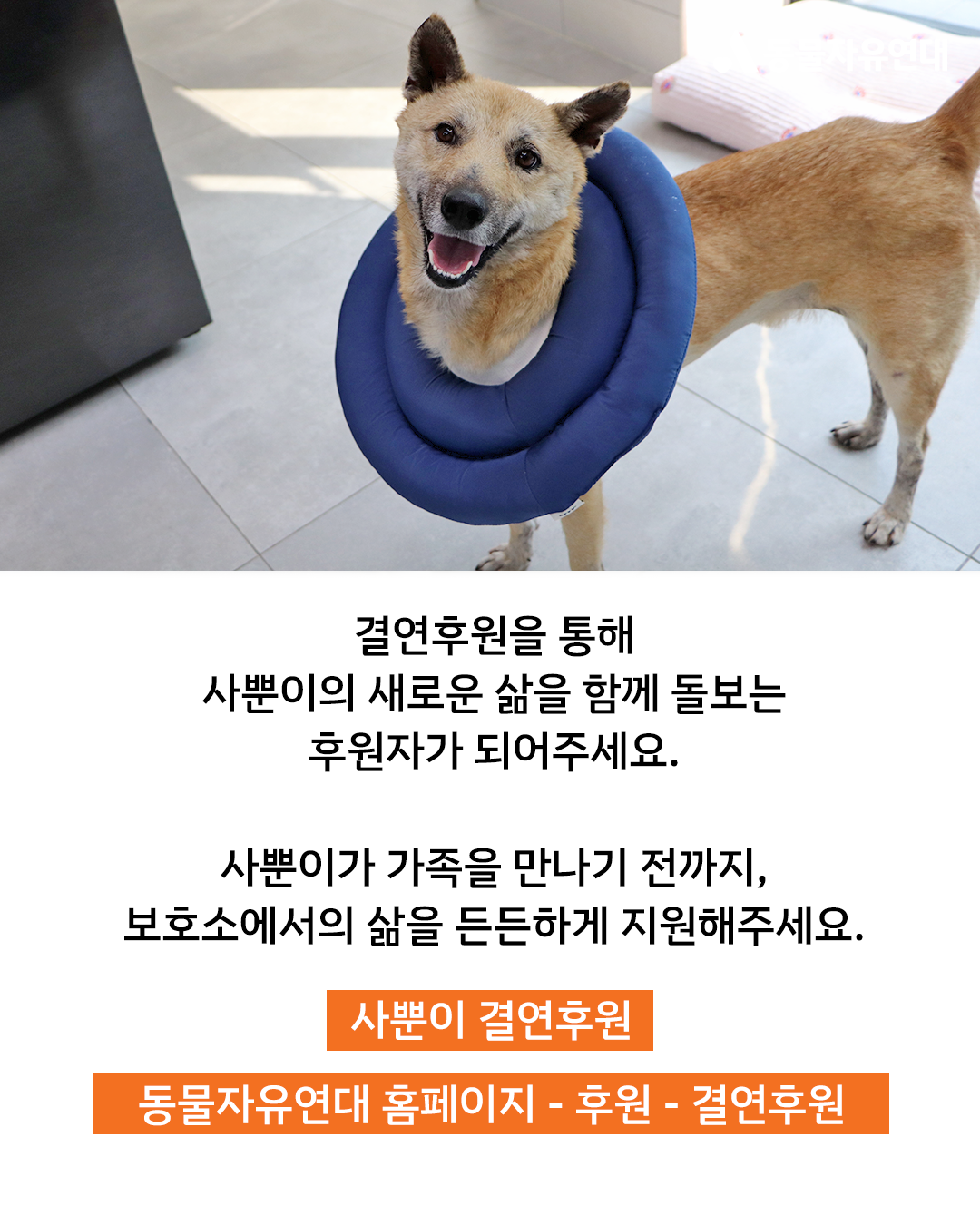 언젠가 사뿐이가 네 발로 마음껏 뛰어다니는 날을 기다립니다. 결연후원으로 사뿐이를 함께 돌보는 마음의 가족이 되어주세요. 사뿐이가 가족을 만나기 전까지 보호소에서의 삶을 든든하게 지원하며 응원해주세요.
