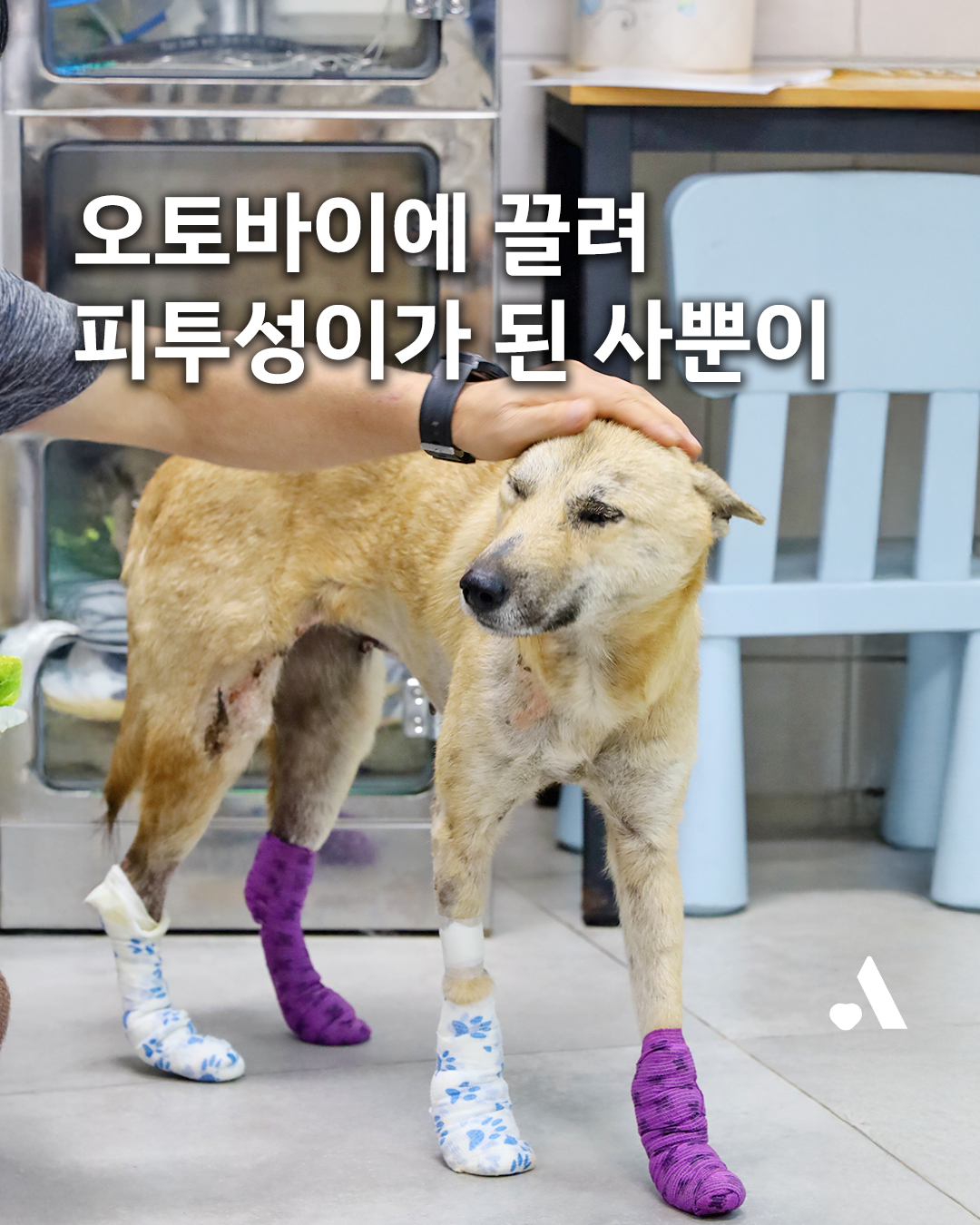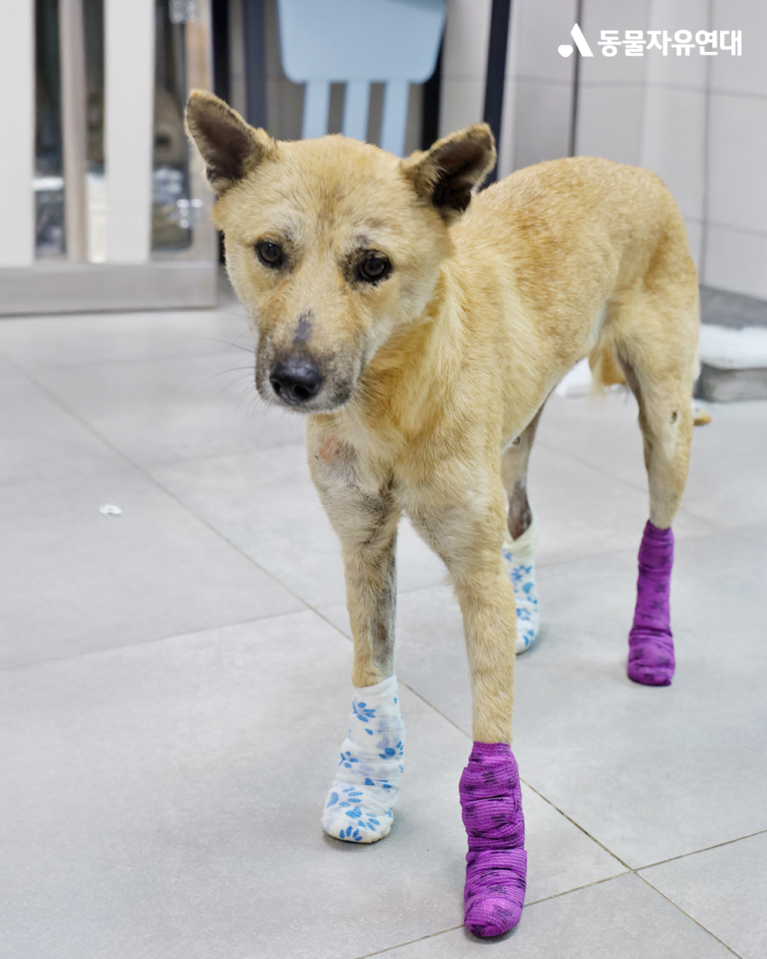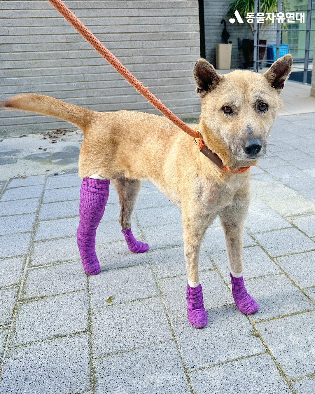 사뿐이는 발바닥 패드와 다리 피부가 크게 까지고 찢겨, 한동안 네 발에 모두 붕대를 감고 지내야 했습니다. 상처를 소독할 때마다 쓰라린 고통이 있을 텐데도 사뿐이는 그저 가만히 활동가의 품에 안겨 있었습니다.