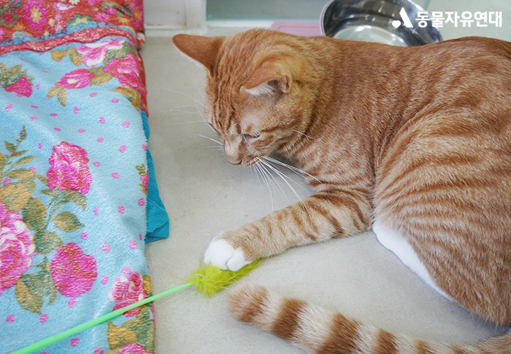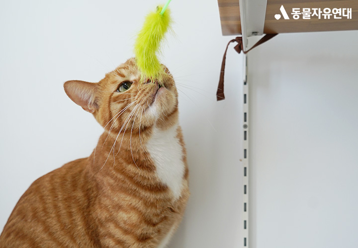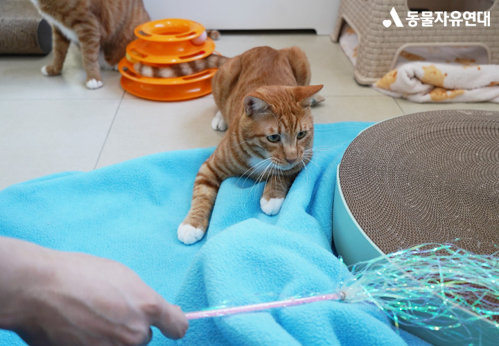 다른 고양이들과 함께 장난감 놀이를 하고, 자리에 서서 가만히 눈을 맞춰주기도 합니다.