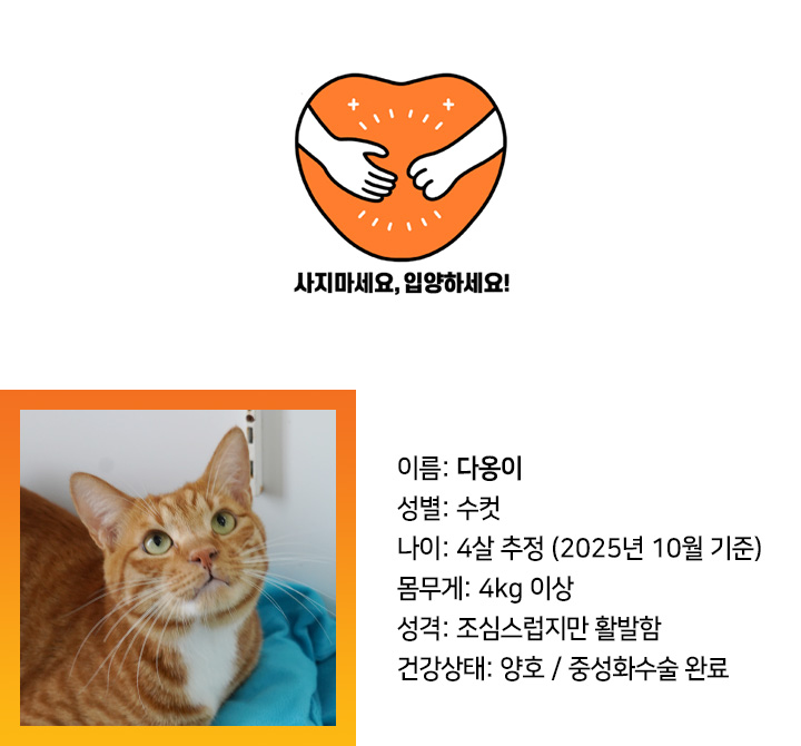 되찾은 소중한 일상을 마주할 다옹이의 가족이 되어주세요!
