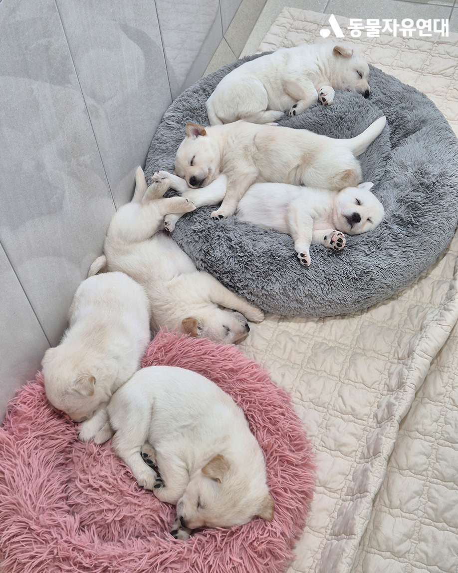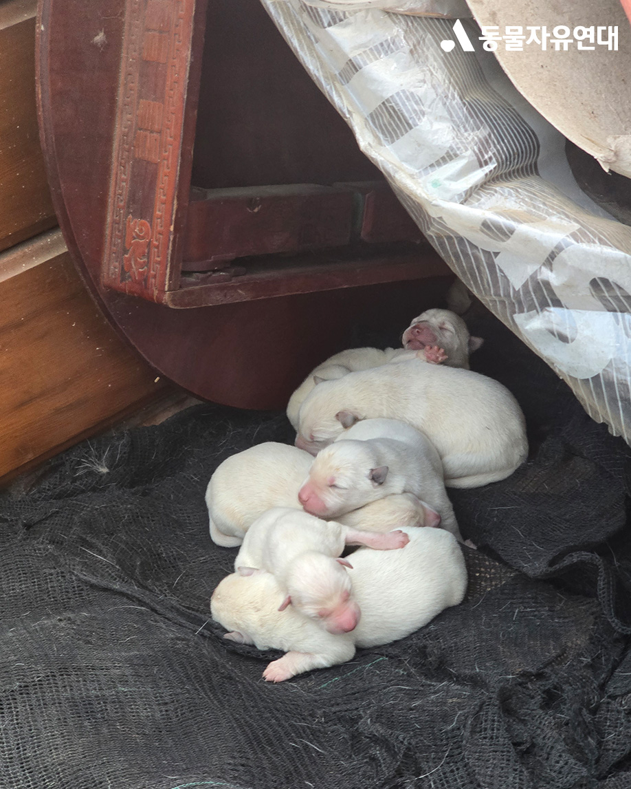 너무 어린 자견들을 모견과 분리할 수 없어, 구조를 멈추고 동물들을 지켜볼 수 밖에 없었습니다. 그렇게 약 3주 후 모견과 자견을 모두 안전히 구조할 수 있었습니다. 모견은 목줄 외상을 치료하기 위해 병원으로 이동했고, 자견들은 모견과 잠시 떨어져 온센터로 오게 되었습니다.