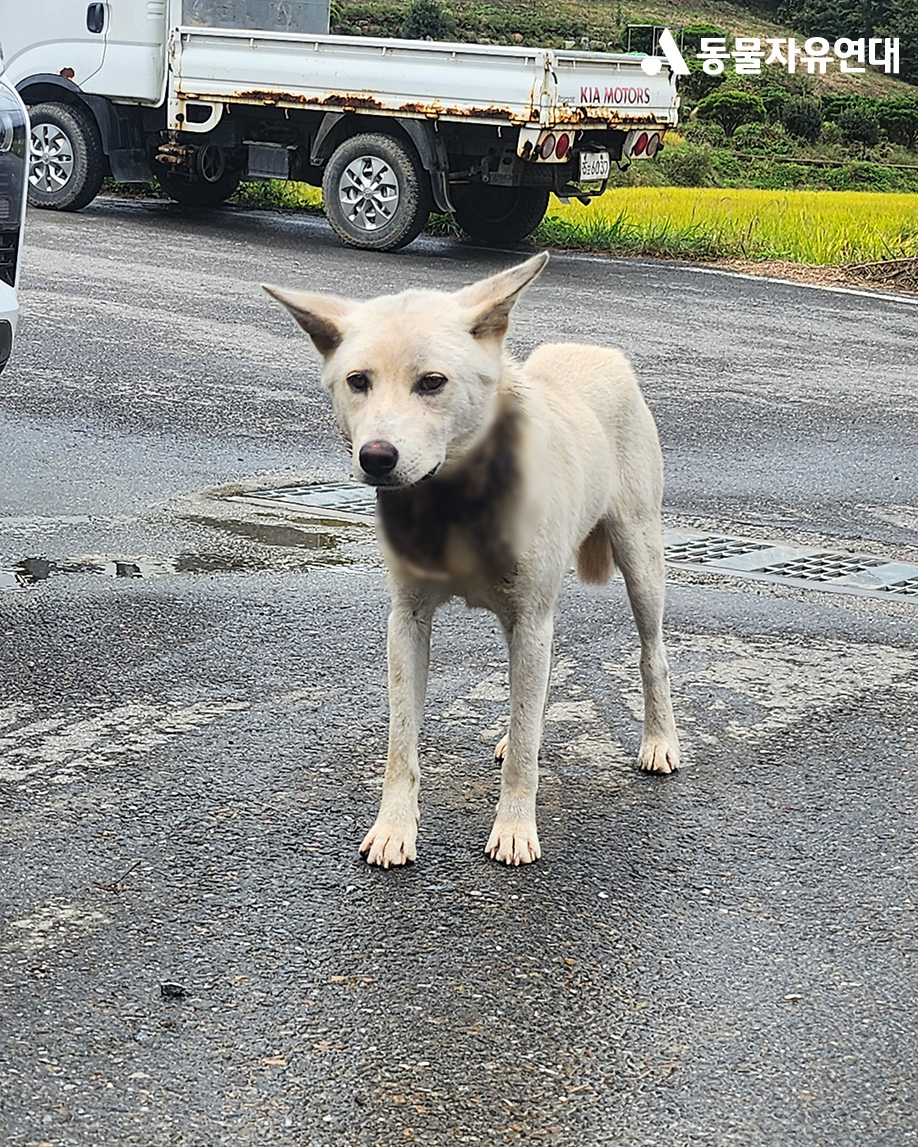 제보 사진 속 떠돌이견은 피와 진물로 목이 온통 젖어 있었습니다. 하얀 색이였을 털은 검게 변해 있었고, 심하게 조여진 목줄은 살을 파고든 상태였습니다. 구조를 위해 향한 현장에는 갓 태어난 자견들이 함께 있었습니다.