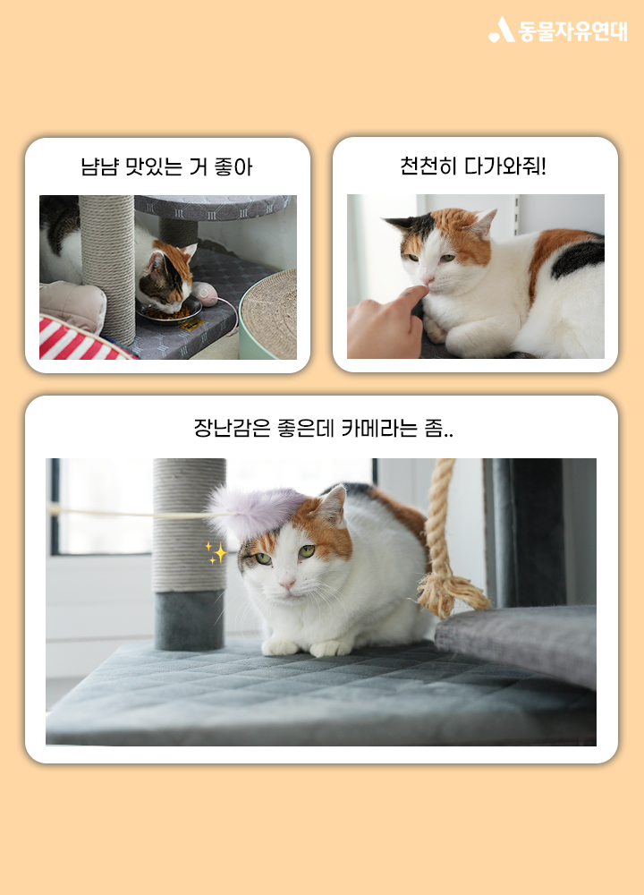 다묘사회성이 좋아 고양이 친구들과 잘 어울려 지내는 순정이의 곁에는 늘 누군가 있습니다.