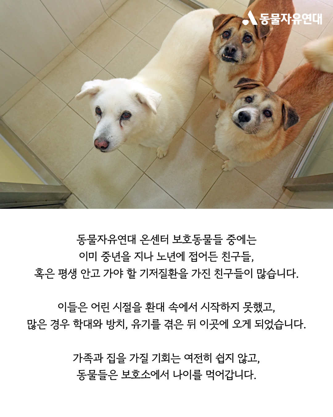 동물자유연대 온센터 보호동물들 중에는 이미 중년을 지나 노년에 접어든 친구들, 혹은 평생 안고 가야 할 기저질환을 가진 친구들이 많습니다. 이들은 어린 시절을 환대 속에서 시작하지 못했고, 많은 경우 학대와 방치, 유기를 겪은 뒤 이곳에 오게 되었습니다. 가족과 집을 가질 기회는 여전히 쉽지 않고, 동물들은 보호소에서 나이를 먹어갑니다.