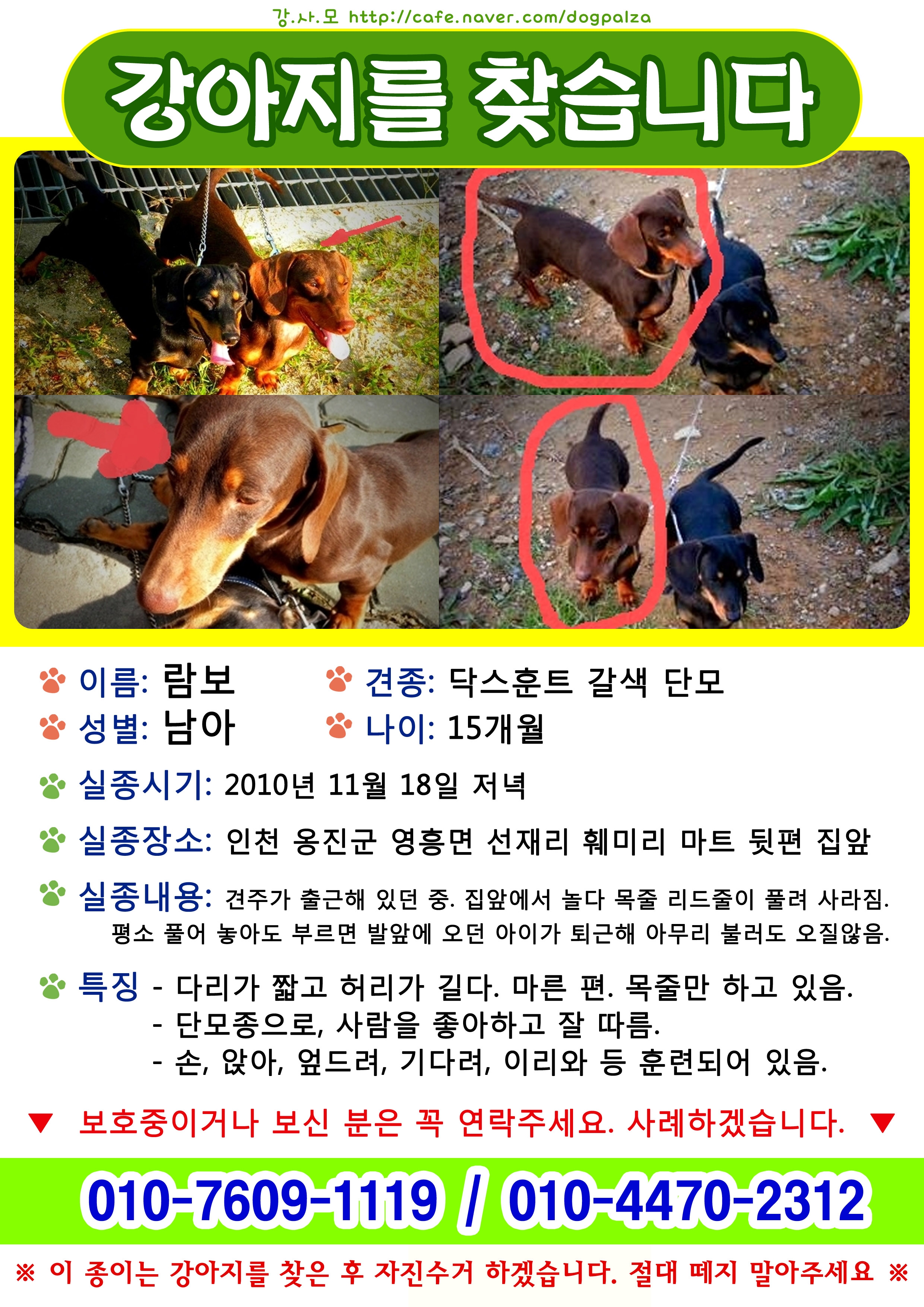 옹진군 영흥면 선재리 닥스훈트 갈색단모 람보 찾습니다!