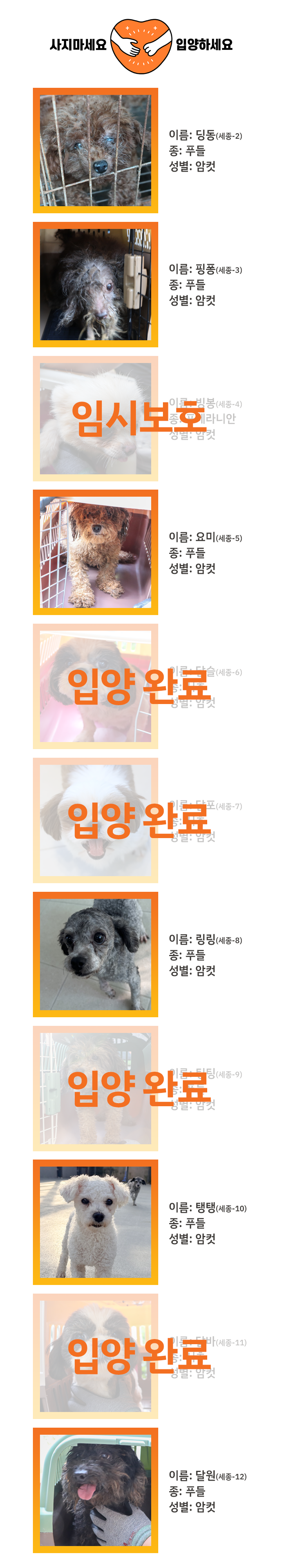 💡 소개된 동물의 세부적인 정보를 한 마리 한 마리 자세히 안내해 드리기 어려운 점 양해 부탁드립니다. (현재 구조견 모두 미용과 목욕, 전염병 검사, 기본 건강검진, 예방접종, 중성화 수술을 진행하고 있습니다.)