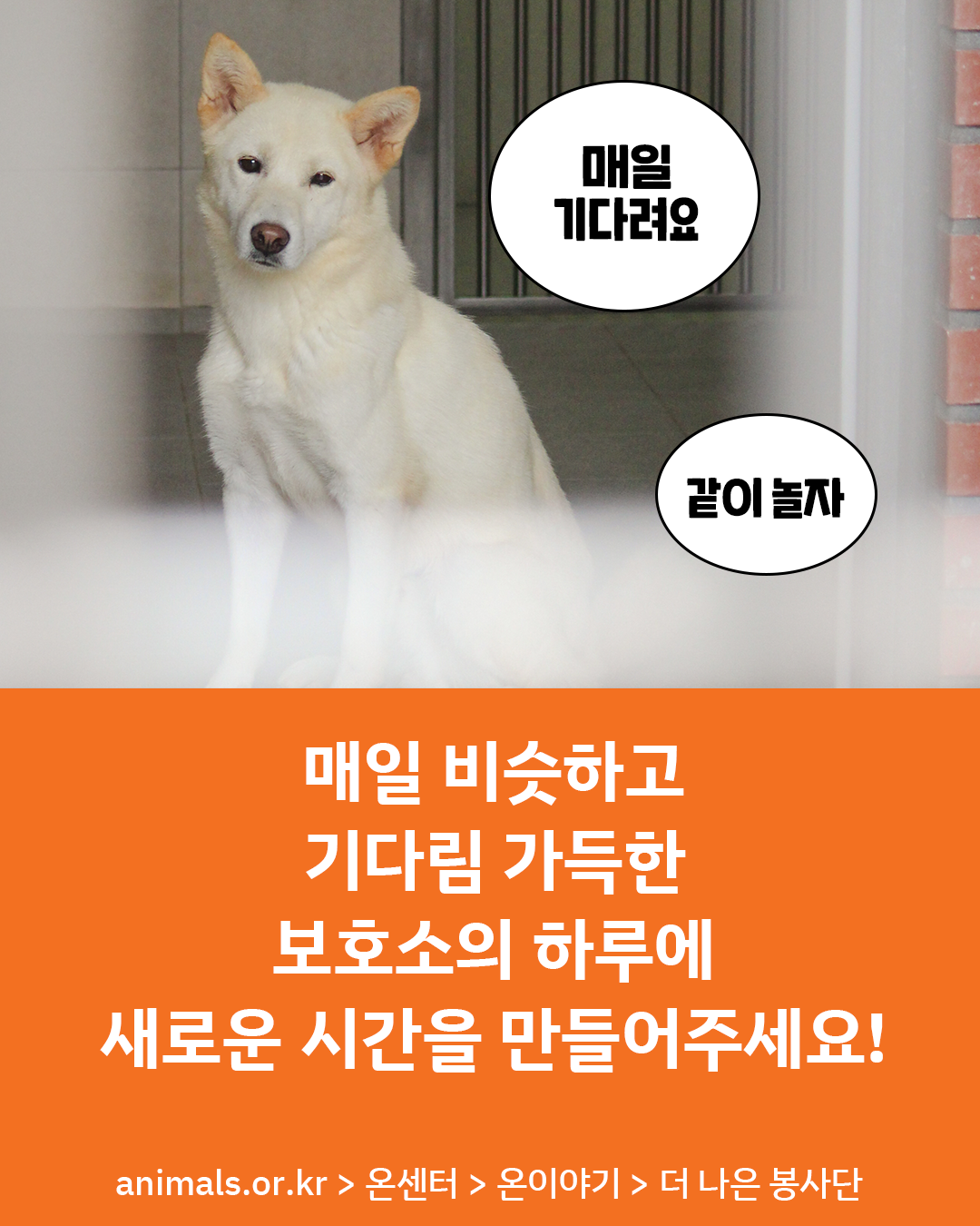 꾸준한 돌봄의 시작으로 새해를 맞이해 보는 건 어떨까요! ’더 나은 봉사단‘은 온센터 보호 동물들의 더 나은 삶을 위한 활동을 합니다. 환경 개선, 놀이 활동, 교감을 통해 동물들의 삶을 바꾸어 나갑니다. 2026년 1월 한 달 동안 온센터 동물들과 함께 시간을 보내주세요!