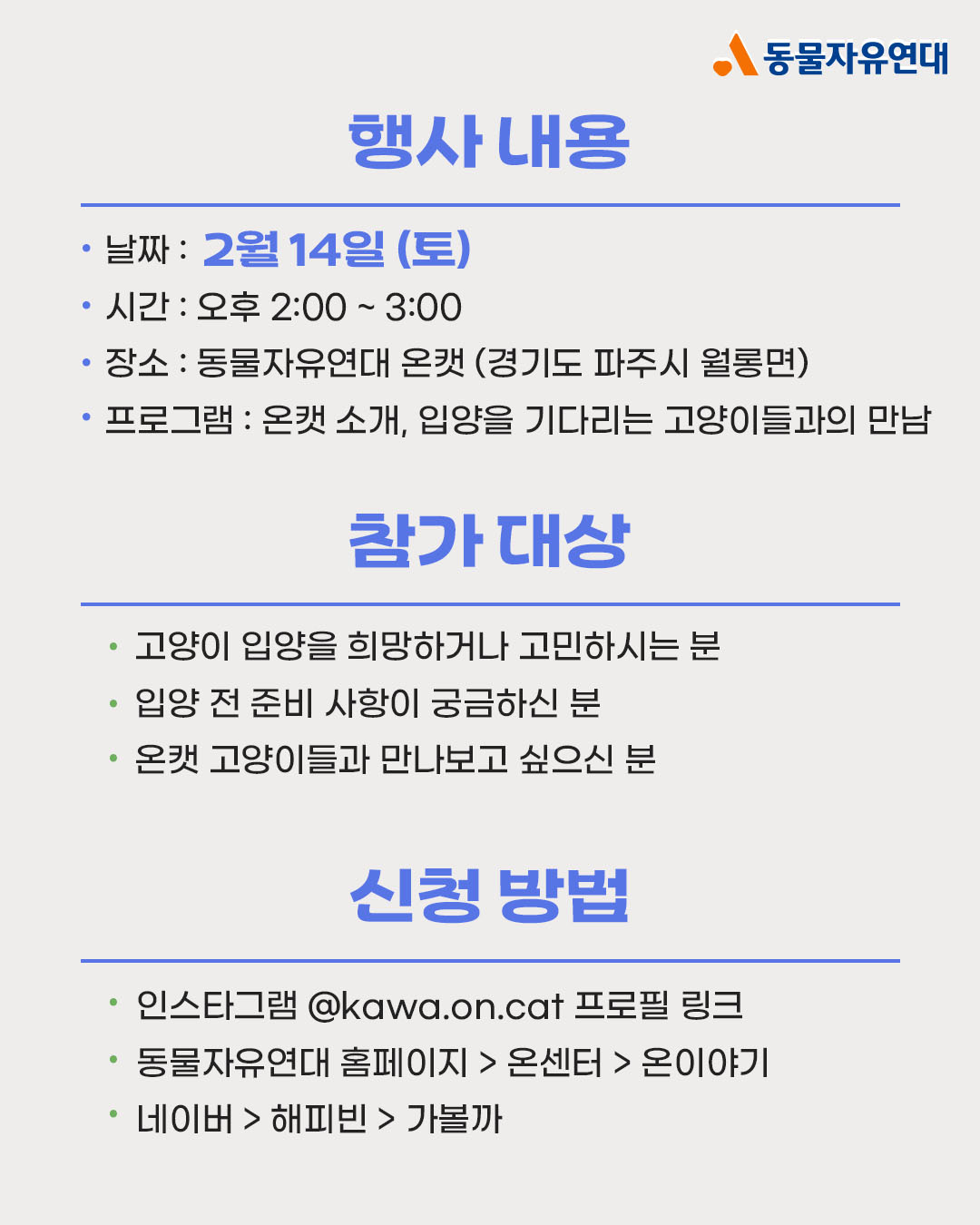 · 프로그램: 온캣 소개, 입양을 기다리는 고양이들과의 만남