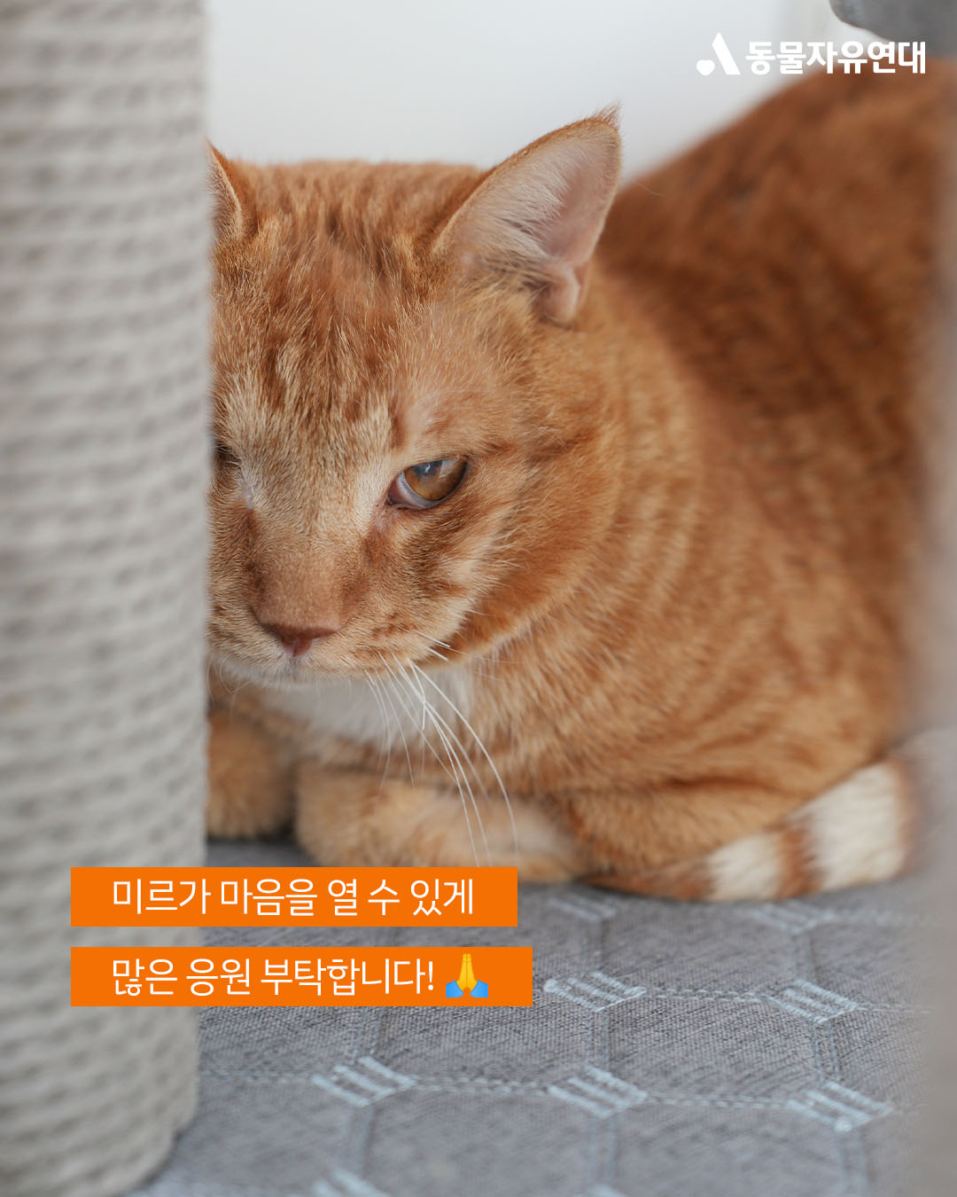 미르가 온캣에 입주한 지 이 주일이 넘었습니다. 처음에는 방 한구석에 몸을 웅크린 채 미동도 없이 지냈습니다. 항상 숨숨집에서 허공을 쳐다보거나 자는 일이 많습니다. 안전하고 평화로운 묘생을 바라며 평화란 뜻을 가진 미르라고 이름을 지었습니다. 앞이 안 보이는 고통 속에서 굳어있던 미르가 온캣에서 따스한 앞길을 찾아갈 수 있도록 응원해 주세요! 🧡
