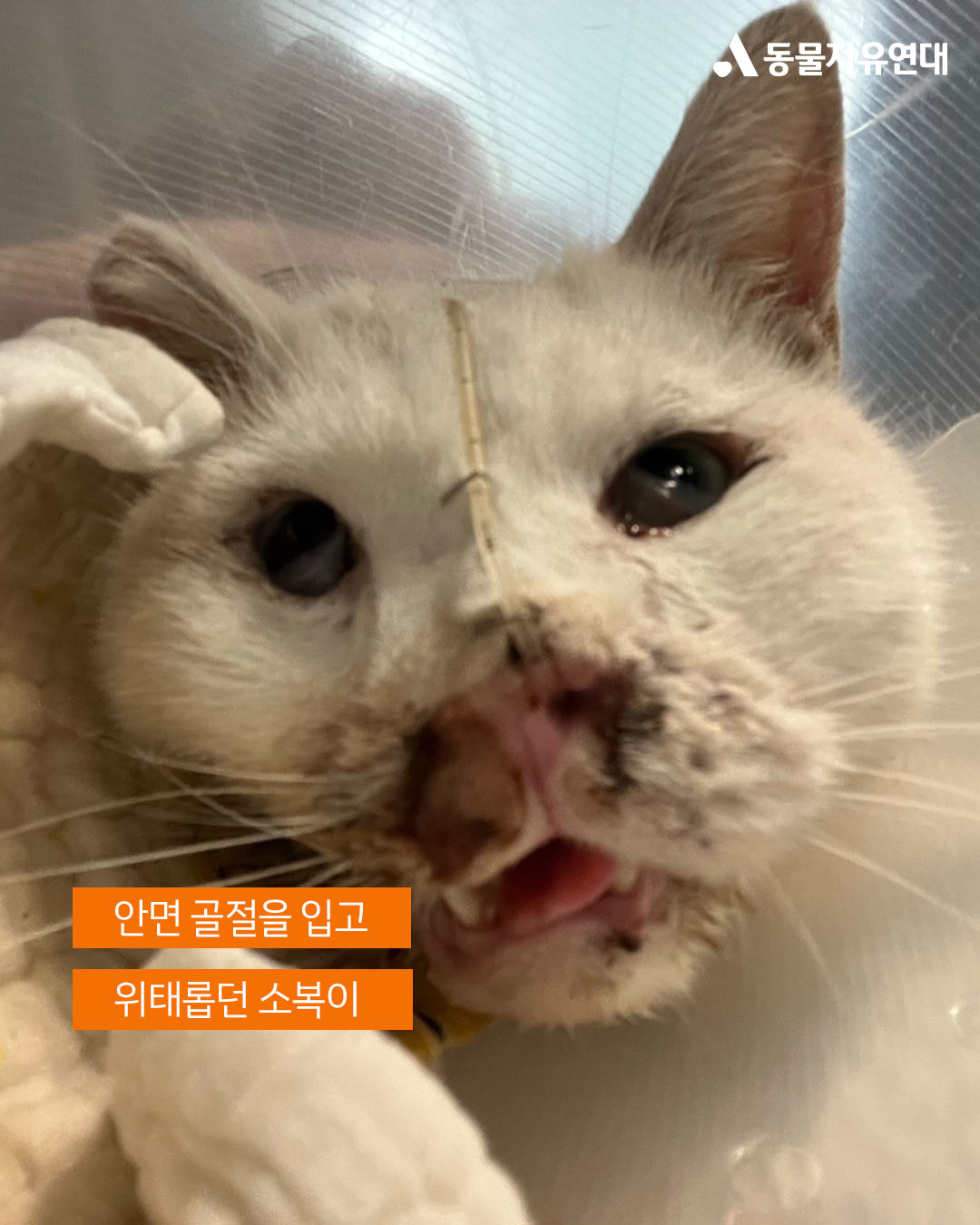 아파트에서 피를 흘리며 빈사 상태로 구조된 소복이. 언제 숨이 끊어질지 모르는 위급한 상황이었습니다. 치료를 하면서 확인된 몸 상태는 절망적이었습니다. 얼굴 전체에 골절을 입은 데다, 염증 수치는 높고 심한 빈혈 상태였습니다. 하루하루가 위태로웠지만, 소복이는 기적 같은 생명력을 보여줬습니다.