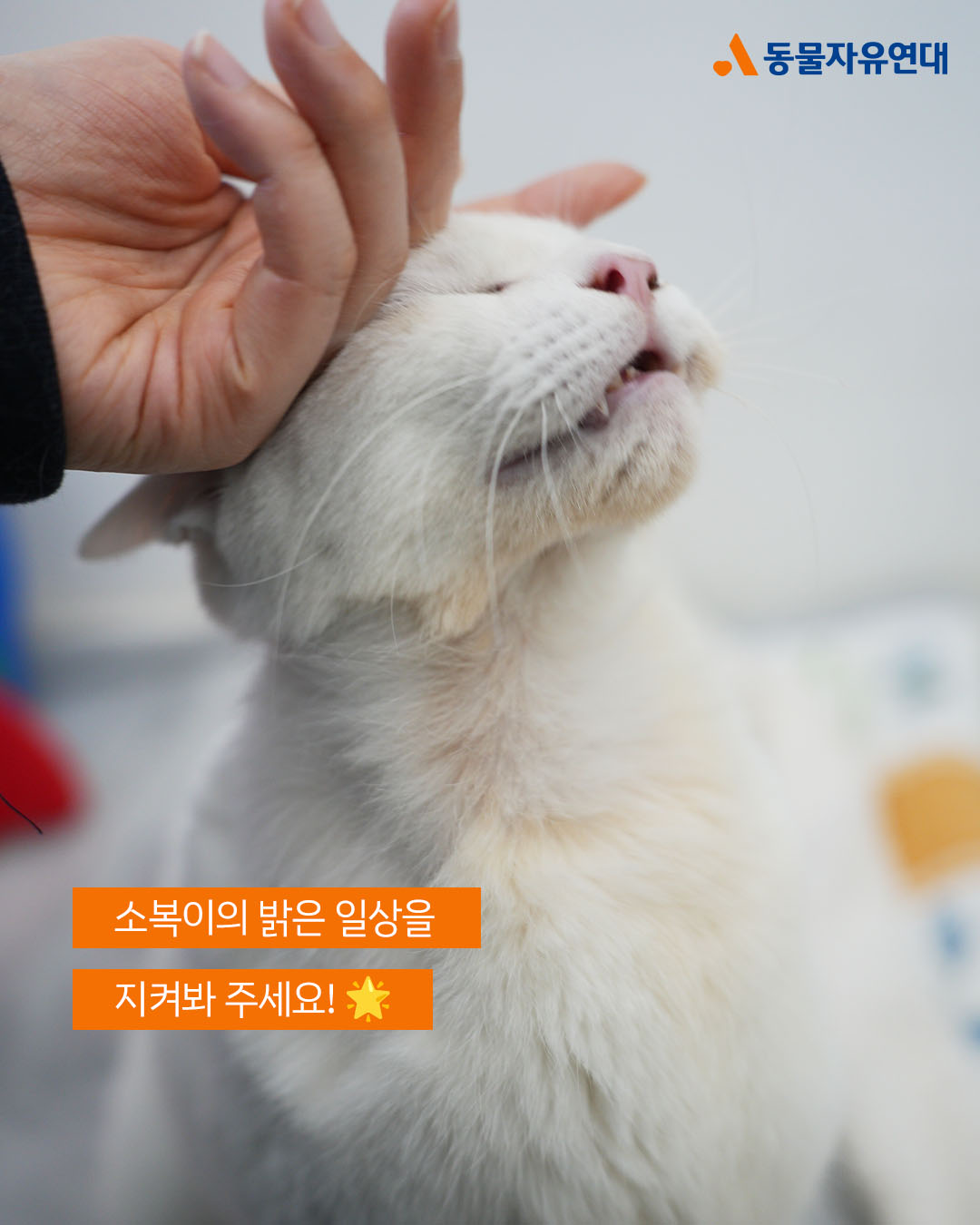 끔찍했던 상처도 소복이가 가진 긍정적이고 활발한 성격은 앗아가지 못했습니다. 소복이 쌓인 눈처럼 더 이상 아픔으로 얼룩지지 않기를 바라는 마음과, 촌스러운 이름일수록 오래 산다는 속설의 힘을 빌려 ‘소복이’라고 이름을 지었습니다. 놀라울 만큼 씩씩하게 행복을 되찾아가는 소복이의 밝은 일상을 지켜봐 주세요! 💖
