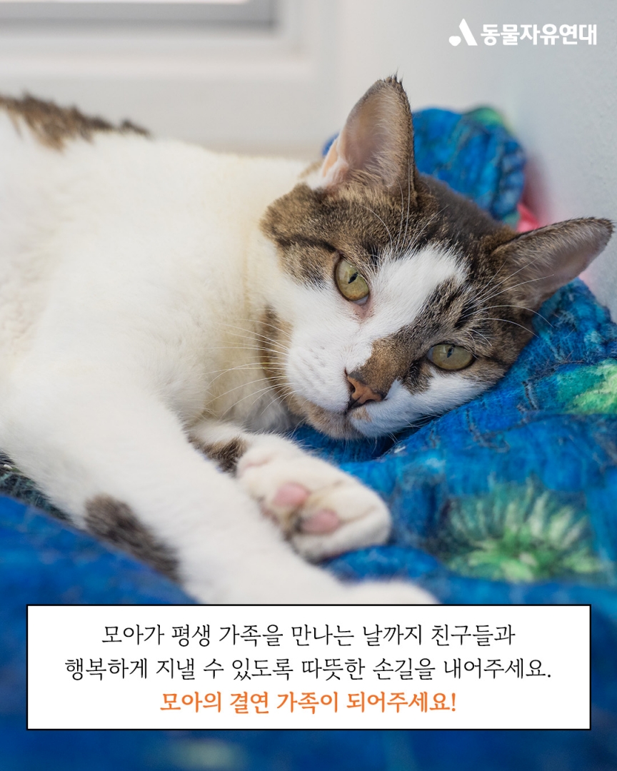 모아는 이제 온캣 활동가와 고양이들의 사랑스러운 친구가 됐습니다. 모아가 평생 가족을 만나는 날까지 친구들과 행복하게 지낼 수 있도록 따뜻한 손길을 내어주세요. 모아의 결연 가족이 되어주세요!