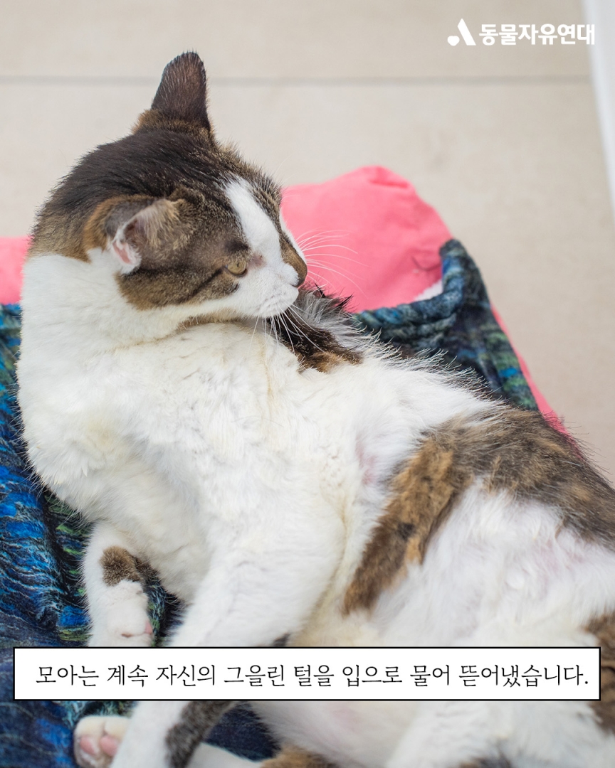 모아는 계속 자신의 그을린 털을 입으로 물어 뜯어냈고, 모아의 방에는 뽑아낸 털이 가득했습니다. 벌러덩 누워 애교를 부리고 있어도, 옆구리 털을 뽑아내 드러난 살이 활동가들의 마음을 아프게 했습니다. 다행히 시간이 흘러 모아는 산불의 트라우마를 극복한 듯 안정을 되찾았습니다.