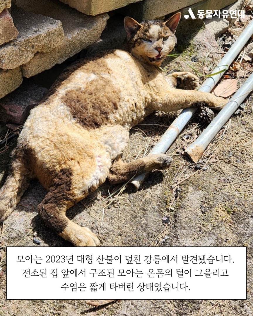 모아는 2023년 대형 산불이 덮친 강릉에서 발견됐습니다. 전소된 집 앞에서 구조된 모아는 온몸의 털이 그을리고 수염은 짧게 타버린 상태였습니다.