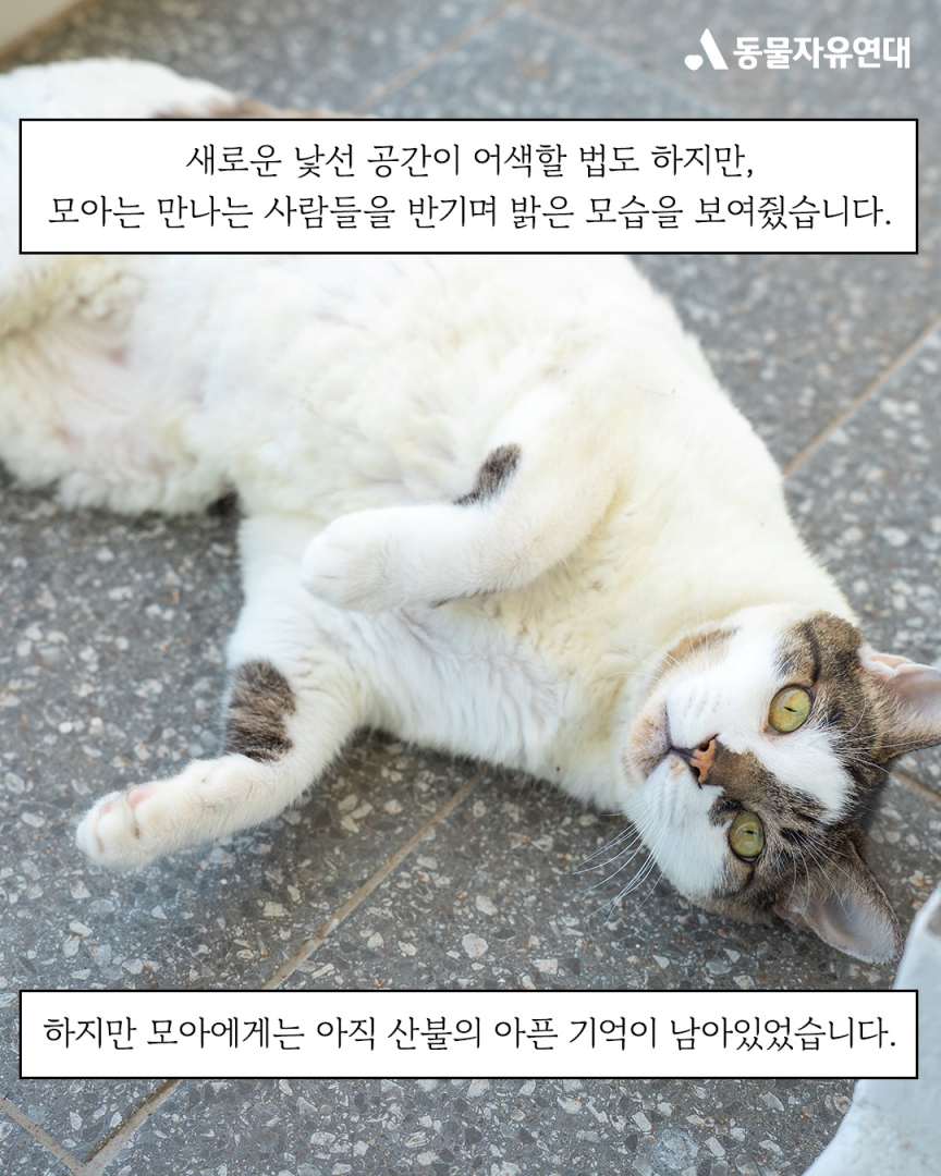 치료를 마친 모아는 온캣에 입주했습니다. 새로운 낯선 공간이 어색할 법도 하지만, 모아는 만나는 사람들을 반기며 밝은 모습을 보여줬습니다. 하지만 모아에게는 아직 산불의 아픈 기억이 남아있었습니다.