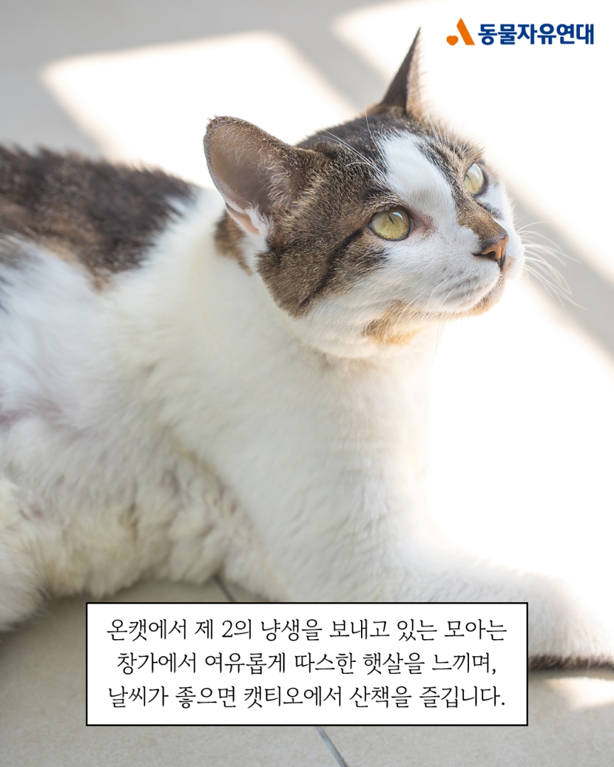 온캣에서 제 2의 냥생을 보내고 있는 모아는 창가에서 여유롭게 햇살을 느끼곤 합니다. 날씨가 좋으면 캣티오에서 산책을 즐깁니다. 활동가와 눈을 마주치면 배를 보이며 벌러덩 드러누워 계속 만져달라고 보채는 사랑스러운 애교쟁이입니다.