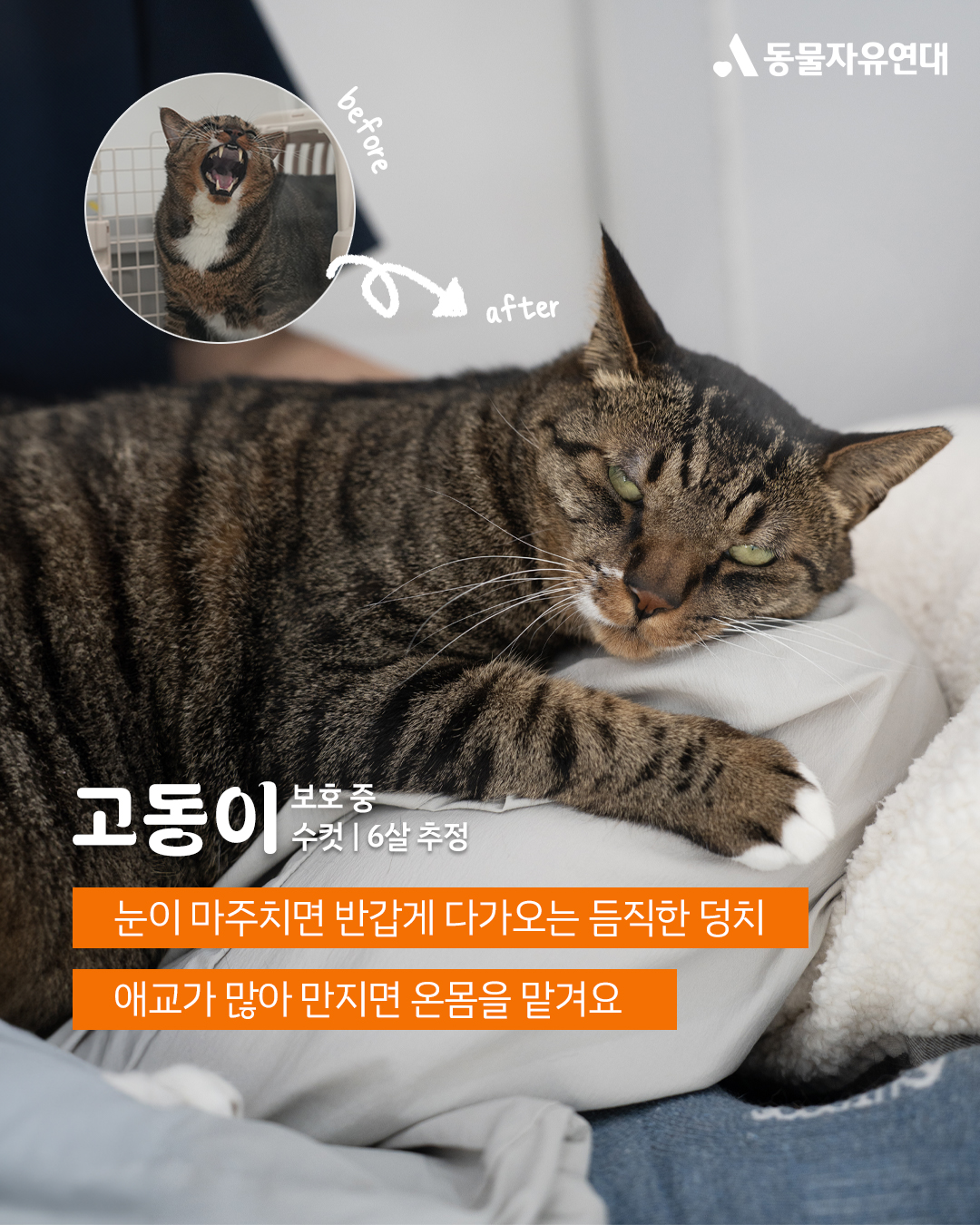 고동이: 얌전히 있다가도 눈이 마주치면 반갑게 다가옵니다. 듬직한 덩치에 애교가 많아 만지면 온몸을 맡기곤 합니다.